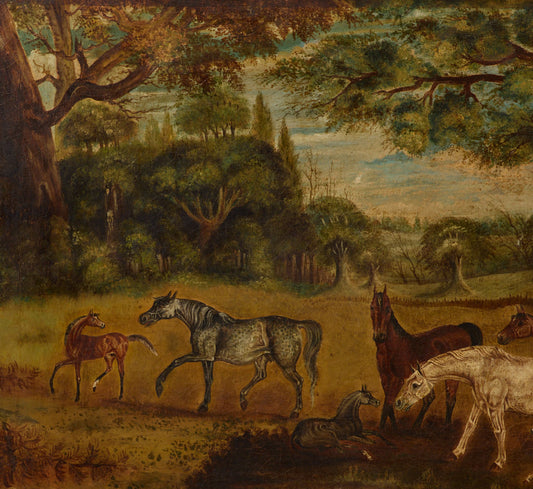 NAIVE ENGLISH 19TH CENTURY HORSES IN A WOODED MEADOW
