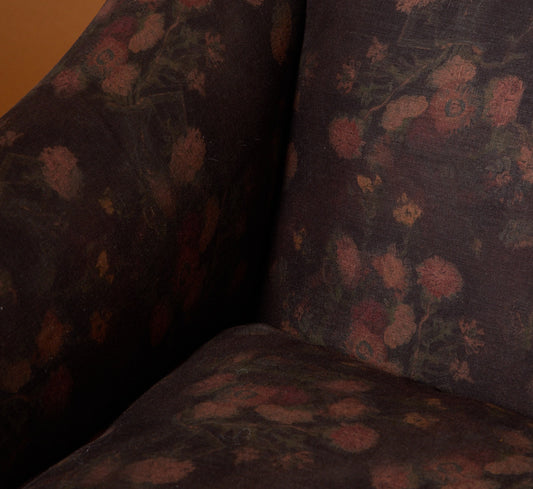 PAIR OF 1950S LOW BACK EASY CHAIRS IN MYSTIC FLORAL LINEN