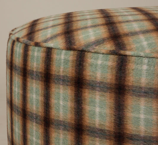 PIERCE & WARD CIRCLE OTTOMAN IN MORALDO WOOL PLAID