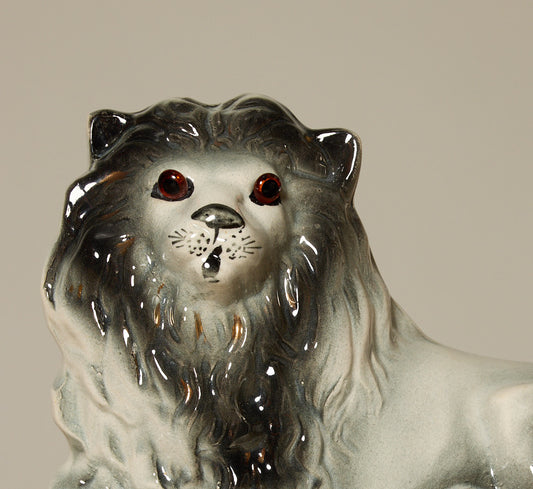 PAIR OF BLACK STAFFORDSHIRE LIONS