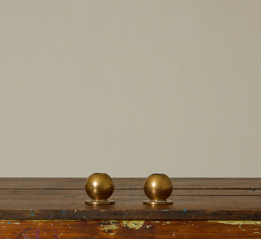 PAIR OF HEAVY DANISH MIDCENTURY BRASS ORB CANDLESTICK HOLDERS