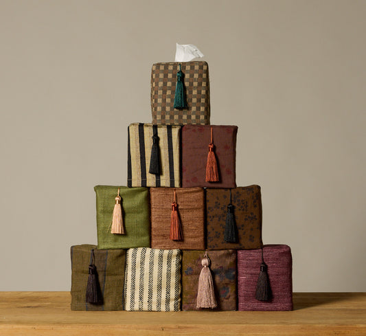 PIERCE & WARD CUMIN LINEN TISSUE BOX COVER WITH BELL FLOWER TASSEL