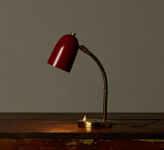 1950S FRENCH MID CENTURY RED AND BRASS GOOSENECK TABLE LAMP