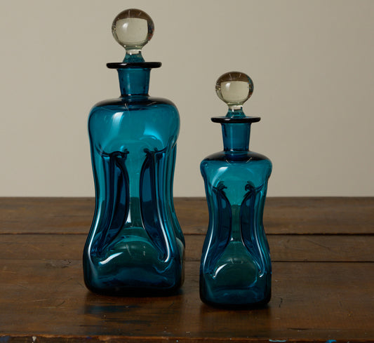 PAIR OF MID CENTURY BLUE GLASS DECANTERS