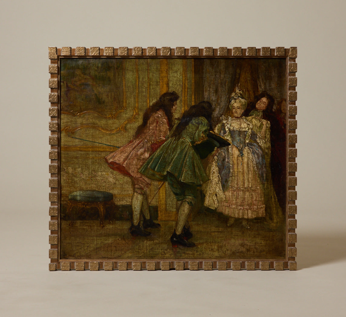 Late 19th century French Impressionist oil painting depicting an aristocratic interior scene with finely dressed figures in period costume set against an ornate palace backdrop. Presented in a