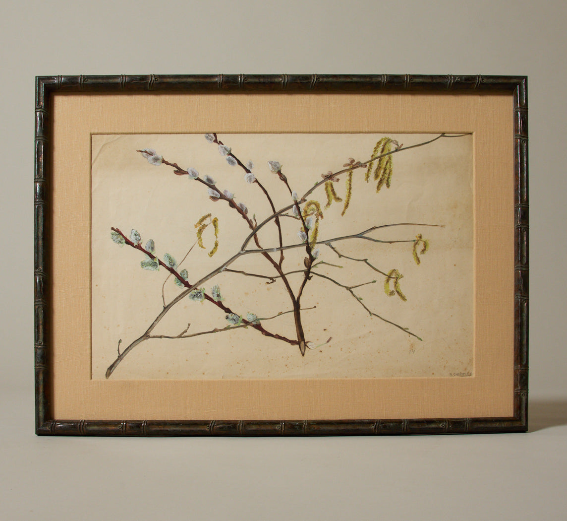 1920 herbarium plant study of budding branches with catkins, rendered in delicate natural tones. Framed in an olive bamboo frame with camel linen mat.