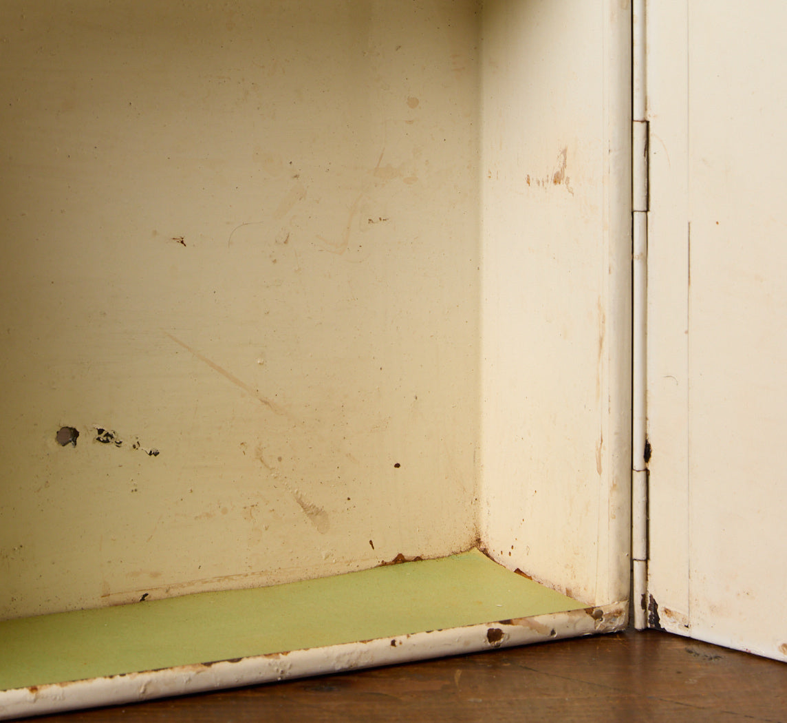 1920s Art Deco metal medicine cabinet with a stepped black exterior frame, mirrored door, and original painted interior with worn patina. Includes wall-mount holes on the back and a single interior shelf.