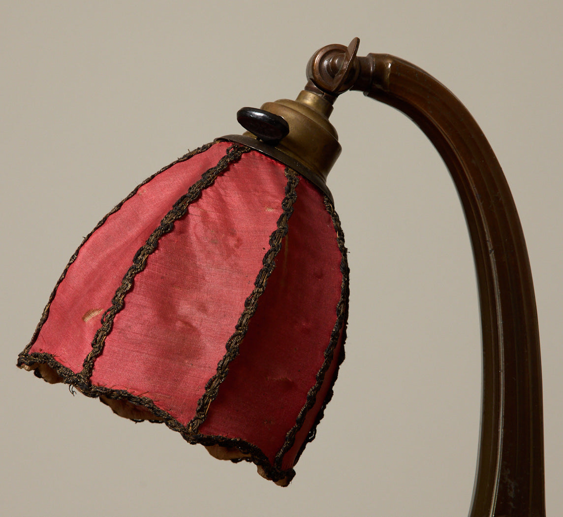 1920s Art Nouveau bronze table lamp with a curved sculptural base and adjustable arm supporting a paneled fabric shade with decorative trim. Newly wired for US use with brown twisted cord.