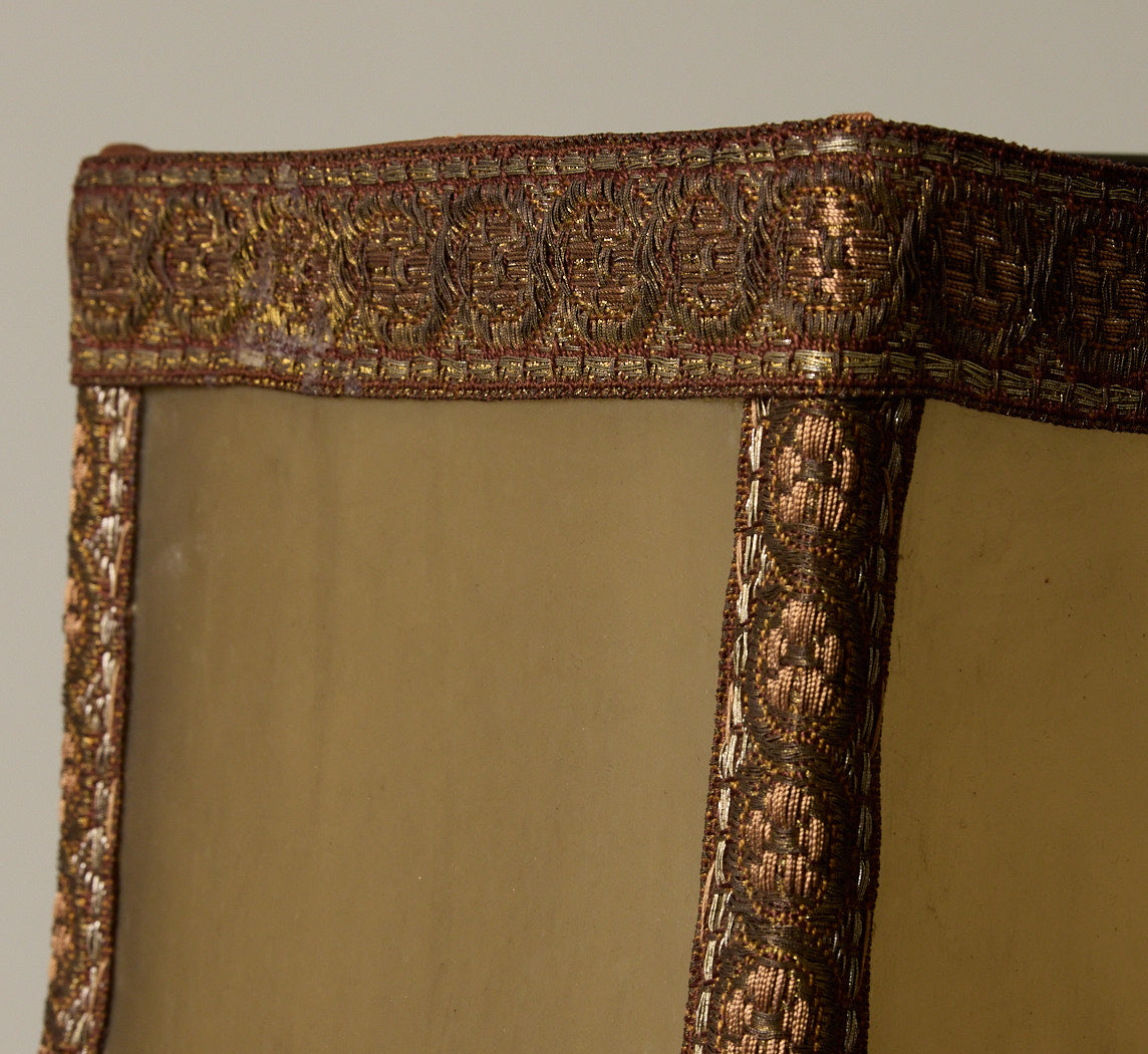 This stunning and incredibly rare 1920s French hand-painted Art Deco lamp shade with metallic thread and fridge detailing.