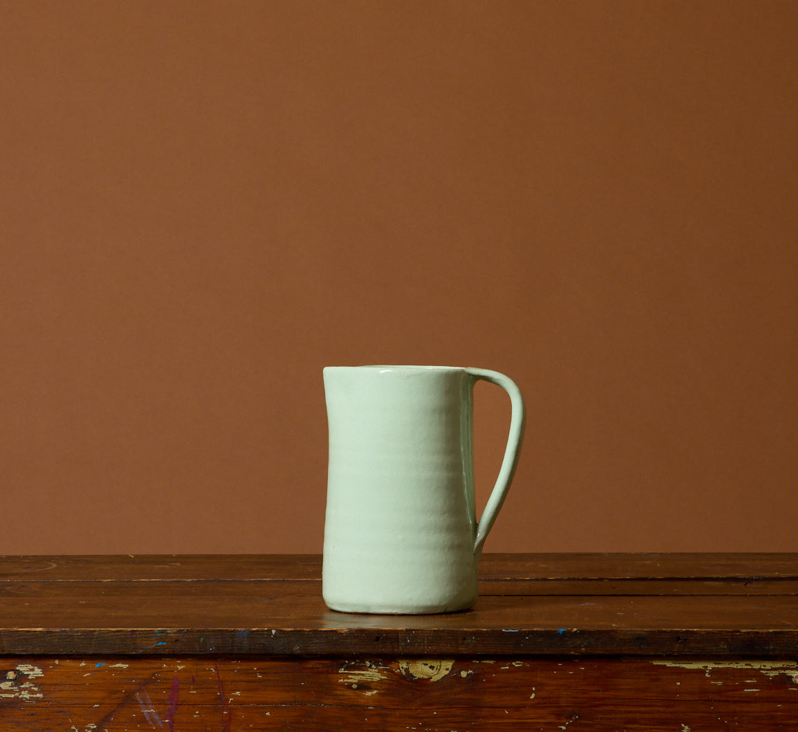 1930s ceramic pitcher with a soft mint green crackle glaze and gently textured body. Cylindrical form with a rounded handle and small pouring spout.