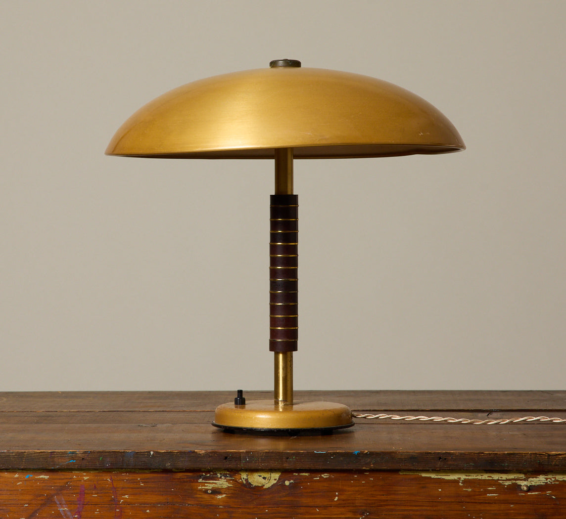 1940s Kaiser SBF table lamp in gold-toned brass with a wide domed shade and Bakelite-accented stem, reflecting Bauhaus and Art Deco design of the Cosack era. The streamlined silhouette casts soft, even light. Newly wired for US use with twisted cord.