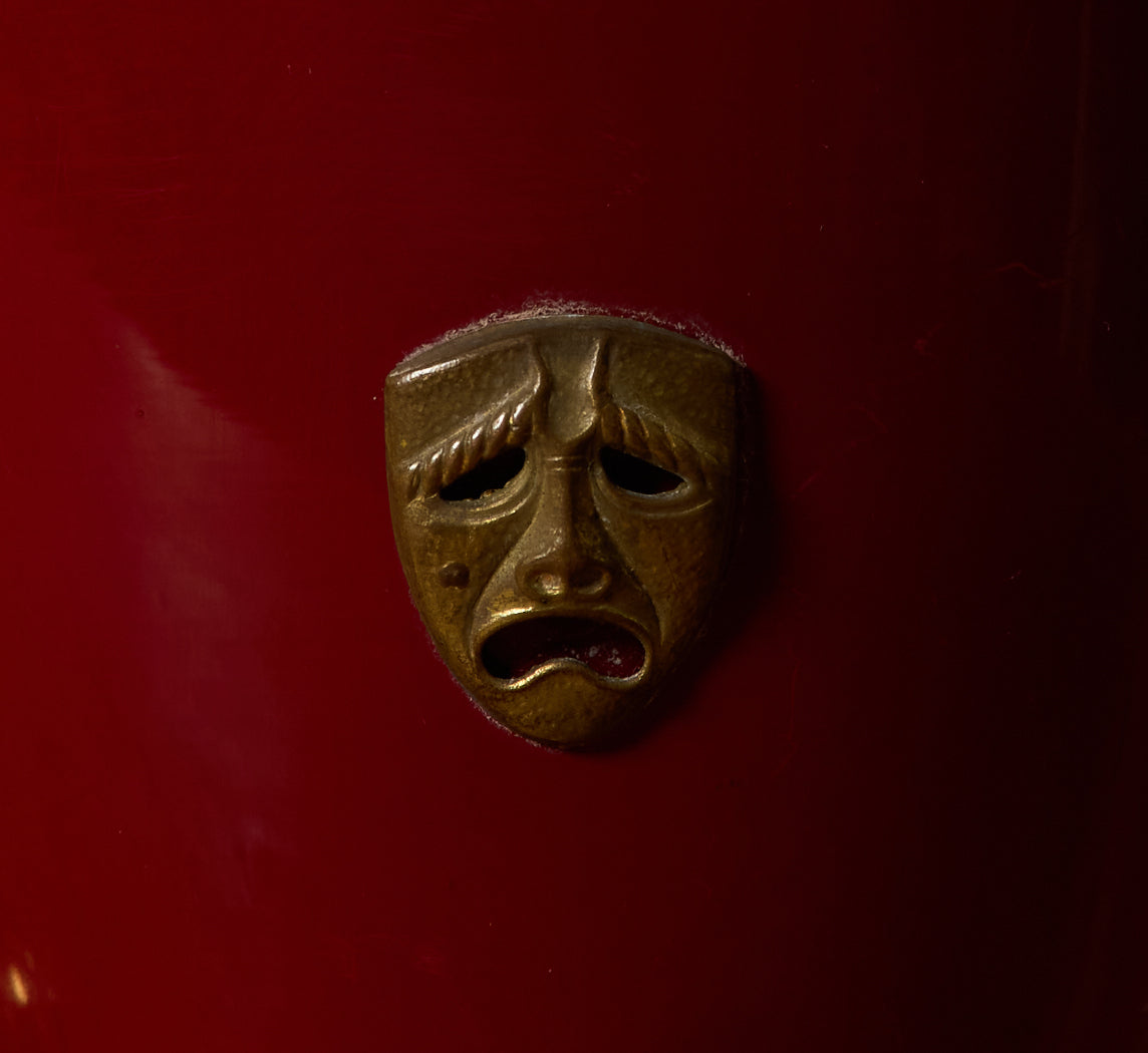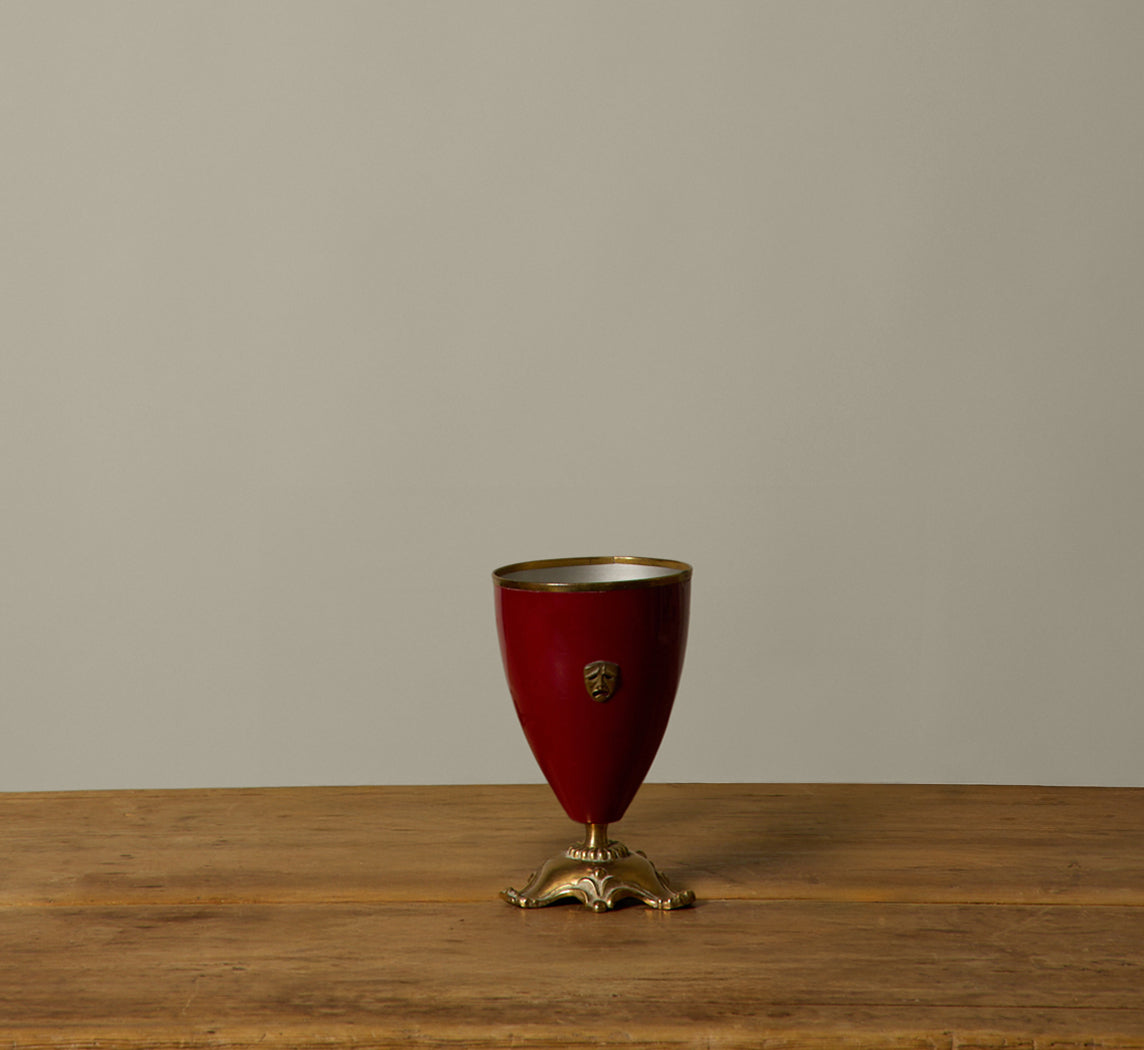 1950s Italian table lamp in the style of Gio Ponti, with ornate brass bases, lacquered red aluminum cones and brass carnival mask details. Newly rewired for the US with twisted cloth cords.