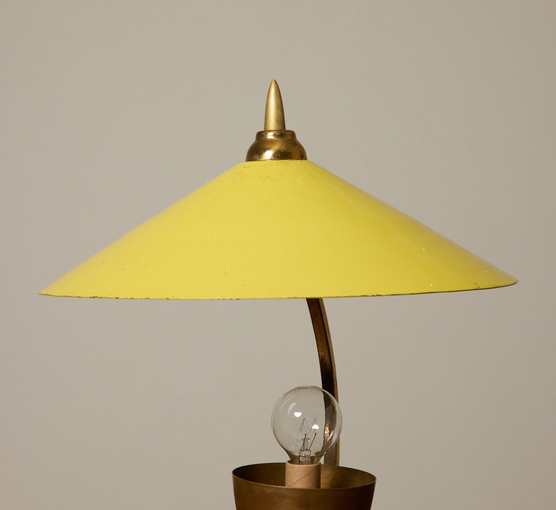 1950s Italian table lamp with a yellow enamel shade, brass stem, and delicate tripod base. The open construction exposes the bulb while casting soft downward light. Newly wired for US use with gold French cord.