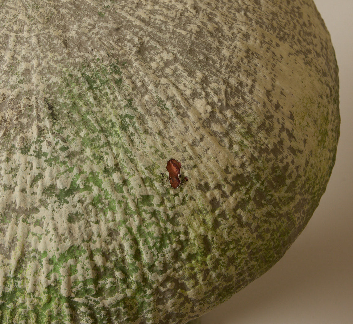 Pair of 1960s cement mushroom garden sculptures with aged moss patina. Hand-cast form with a rounded cap and flared stem, suitable for outdoor display or decorative accent. Patina throughout consistent with age.