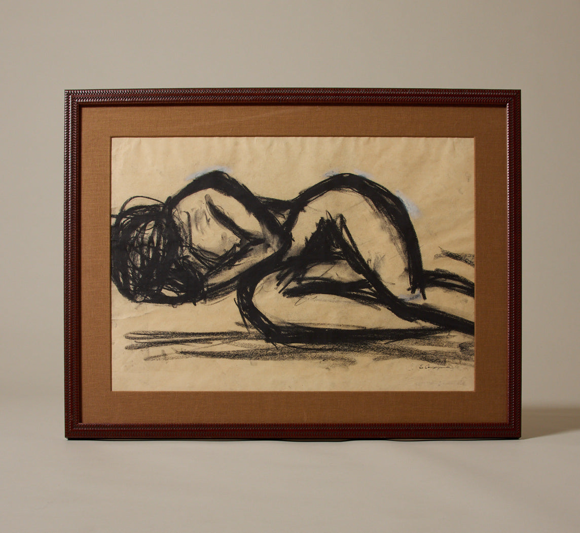 1970s charcoal study of a reclining female nude, drawn with bold gestural lines on toned paper. Framed in a peat linen mat and carved wood frame.