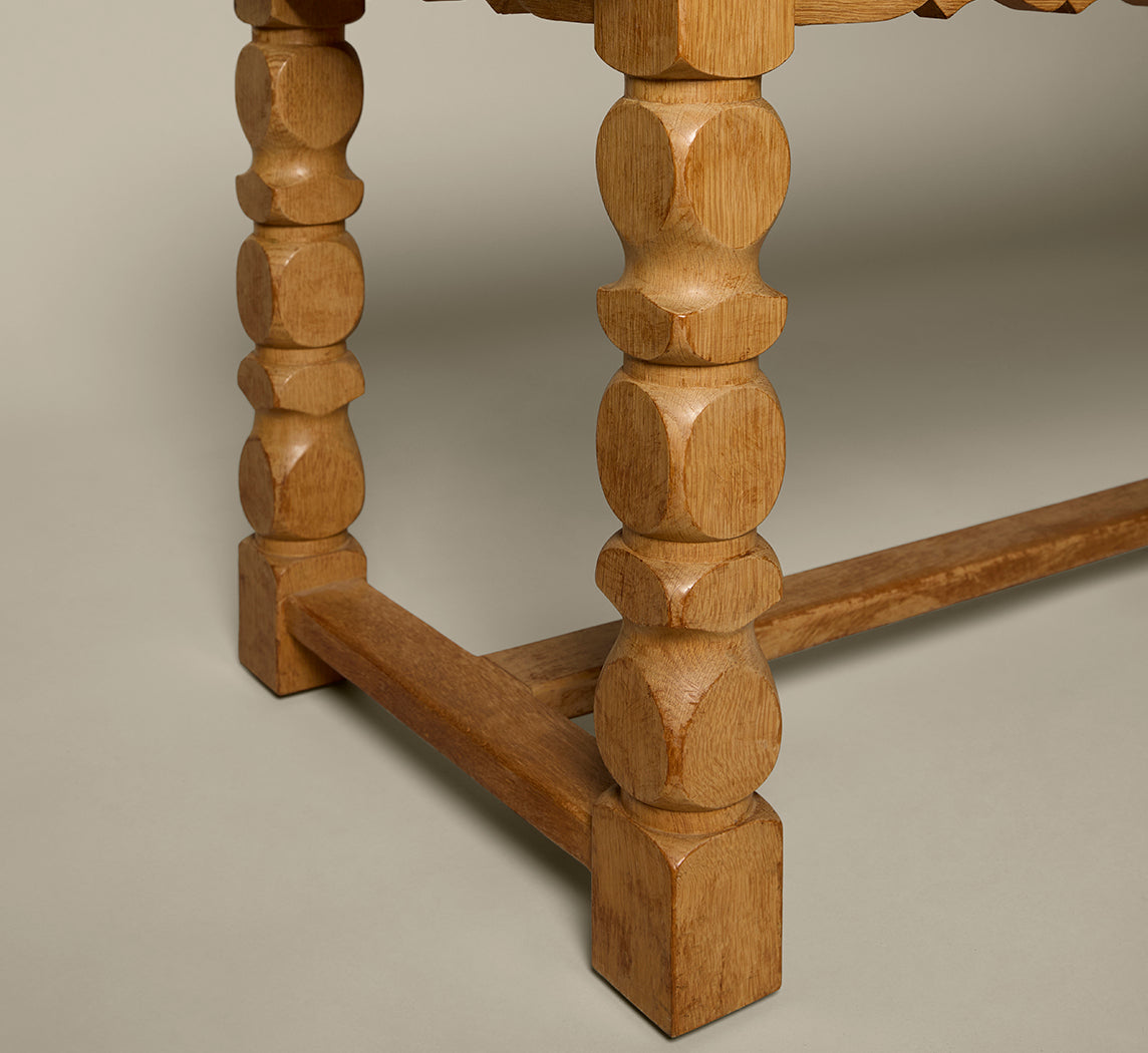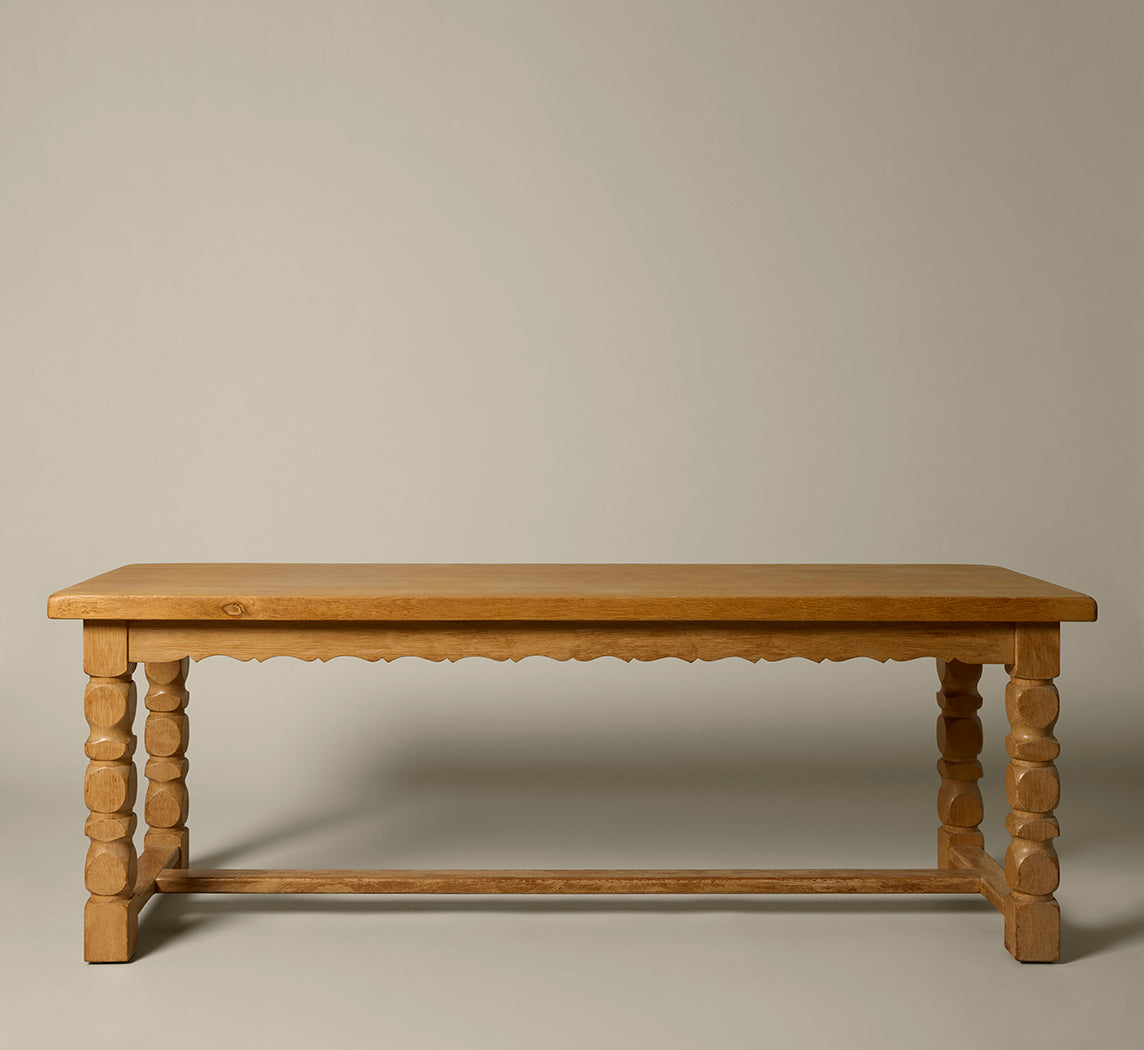 This Danish mid-century solid oak coffee table, featuring sculpted legs and dating from the 1970s, is crafted in the style of Henning Kjaernulf.