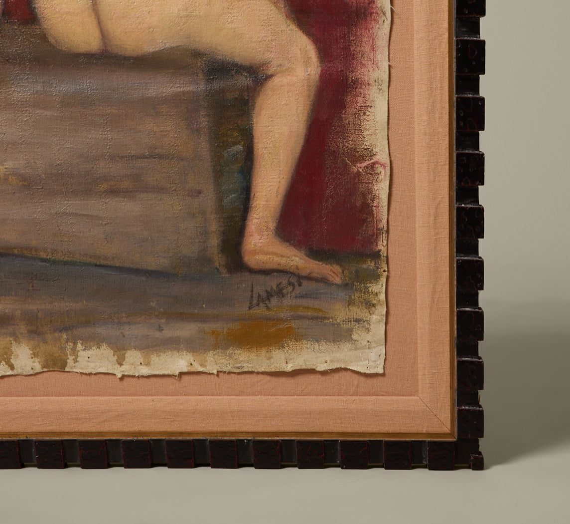 19th-century Italian oil painting of a seated nude, signed by Temistocle Lamesi (1870–1957). Warm flesh tones against a deep red field, framed in a geometric frame with praline linen mat.