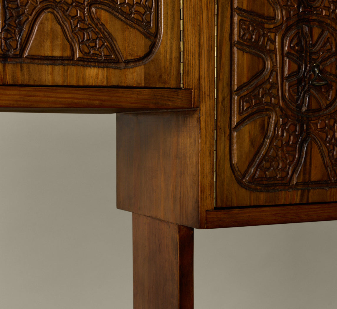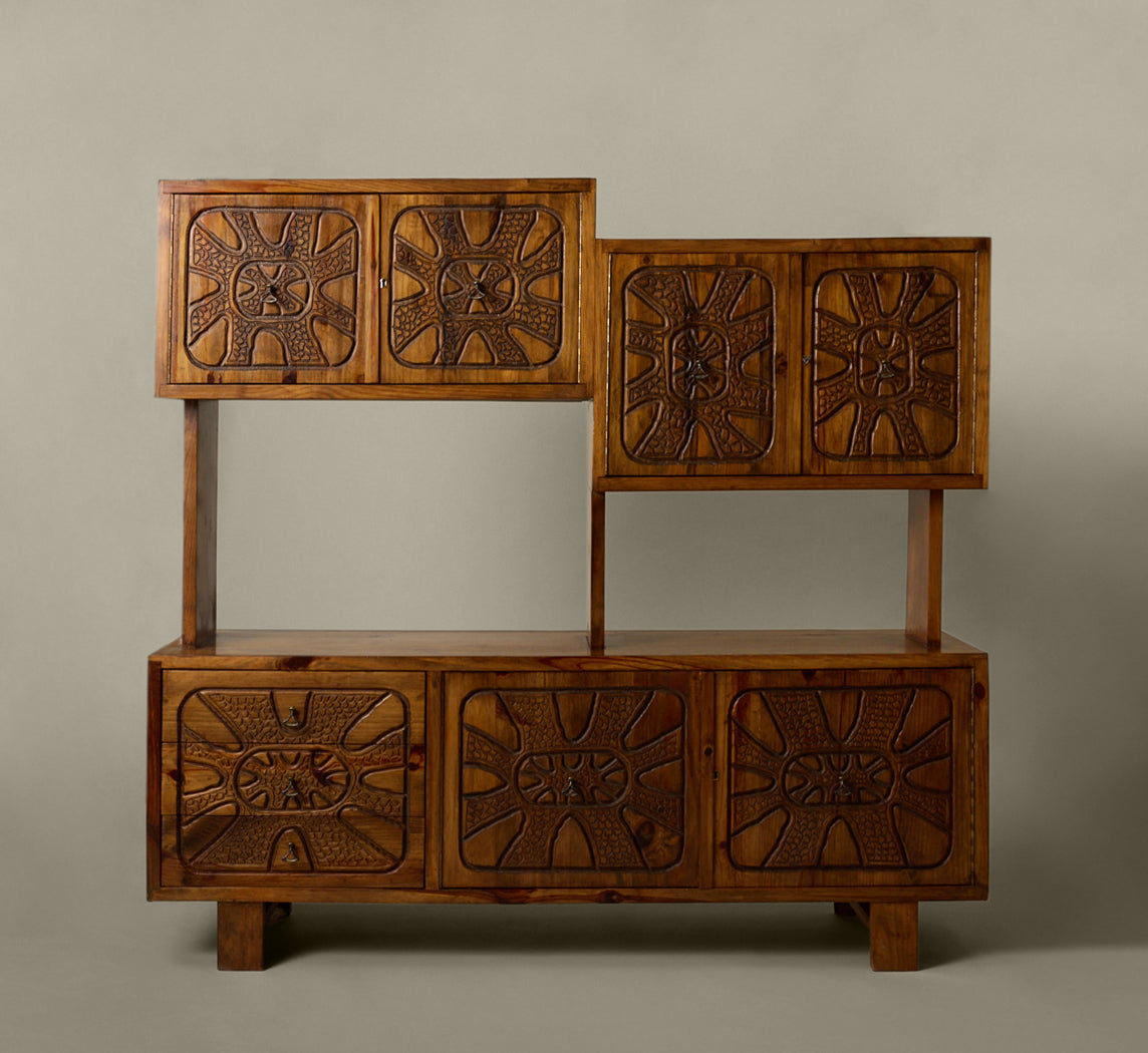 1960s Brutalist credenza with deeply carved geometric doors and bold sculptural form.