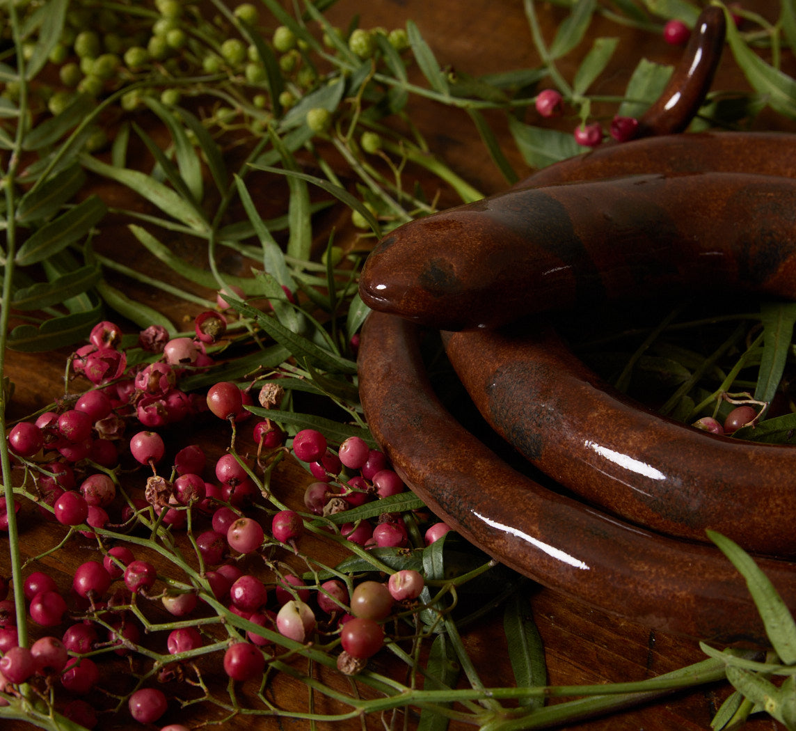 American Folk Art hand formed coiled serpent with a rich brown glaze and subtle mottling, compact in scale for tabletop display.