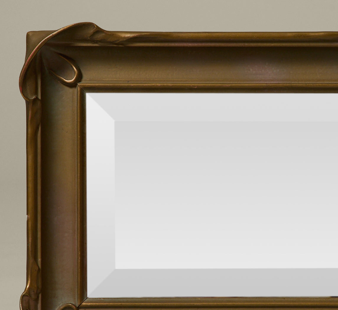 Art Nouveau mirror with a sculptural verdigris-patinated frame and flowing corner details. Newly added beveled mirror glass, paper-backed with wire for hanging.
