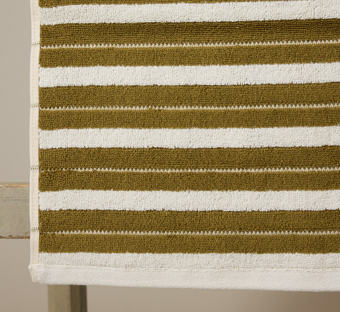 San Luis hand towel by Baina in caper and chalk, made in Portugal from soft organic cotton with reversible striped sides.