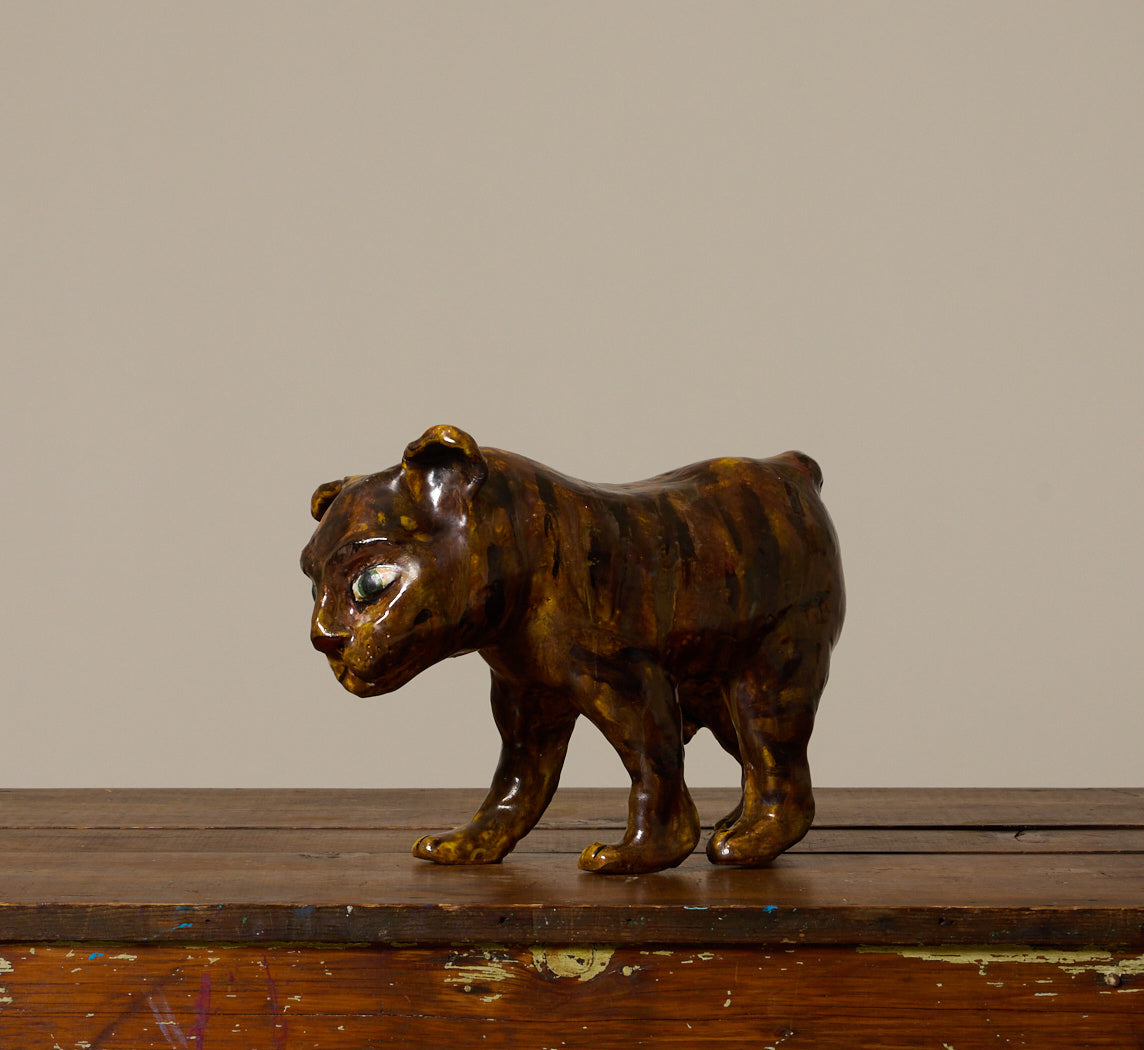 Bella Bruta Sculpture by Tina Charad, a hand-crafted ceramic creature with a glossy brown glaze, subtle striping, and exaggerated, expressive features. Compact and full of personality, it lends a playful, artful touch to any shelf or tabletop.