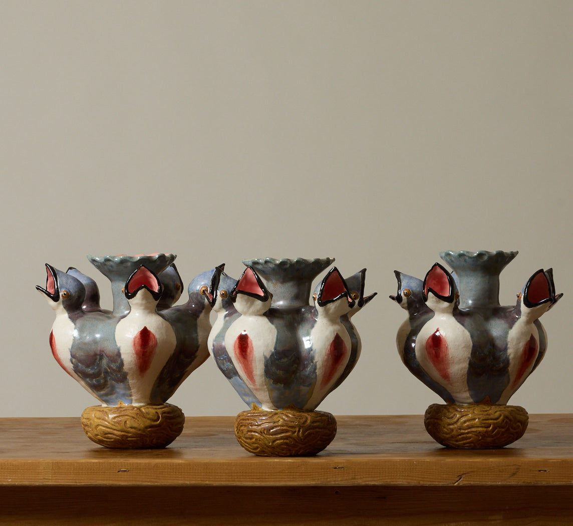Stoneware tulipiere by Pearce Williams shaped as a nest of open-mouthed chicks with hand-painted glazes in blue, cream, and red. Part of the Super Nature collection, merging avian form with functional vessel design.