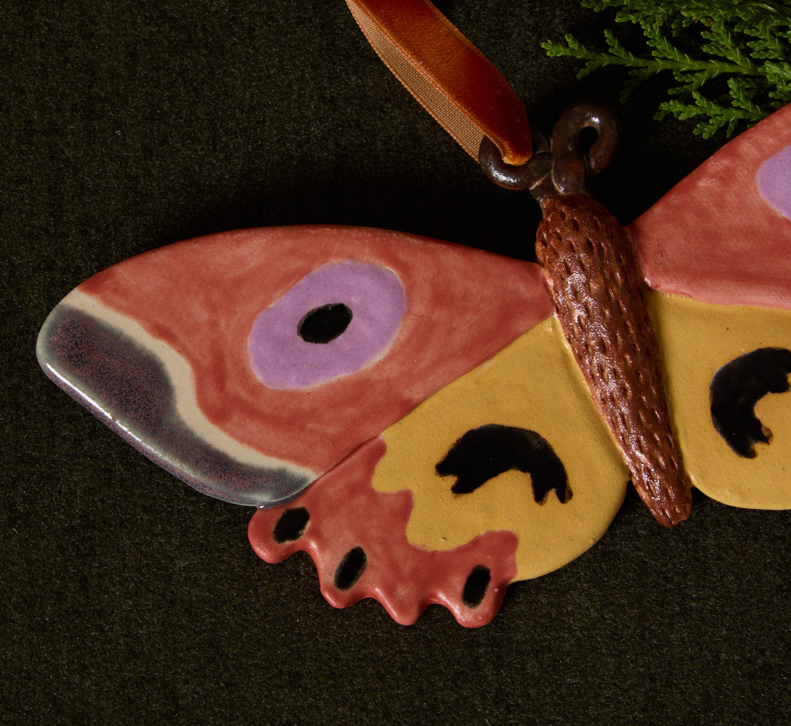 Butterfly ornament by Pearce Williams with sculpted stoneware wings in warm red and golden yellow, accented by bold lilac eye spots. Finished with a textured body and velvet ribbon tie for hanging. Handmade in New Orleans especially for Pierce & Ward.
