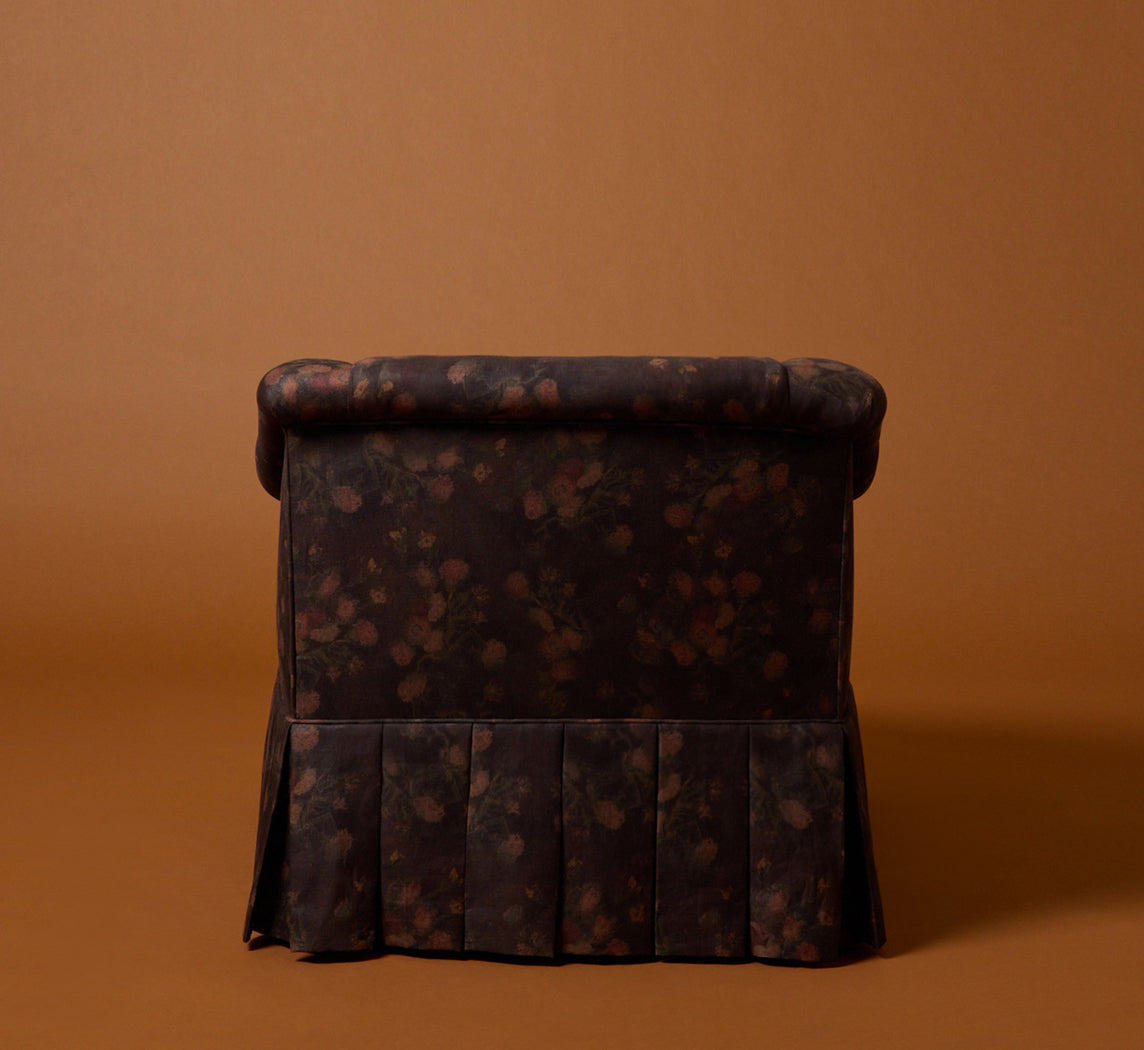 Pair of 1950s low back easy chairs with deep seat cushions and pleated skirt bases, upholstered in dark mystic floral linen with muted rust and olive tones. Soft rolled arms and a relaxed silhouette give them an easy lounge feel.