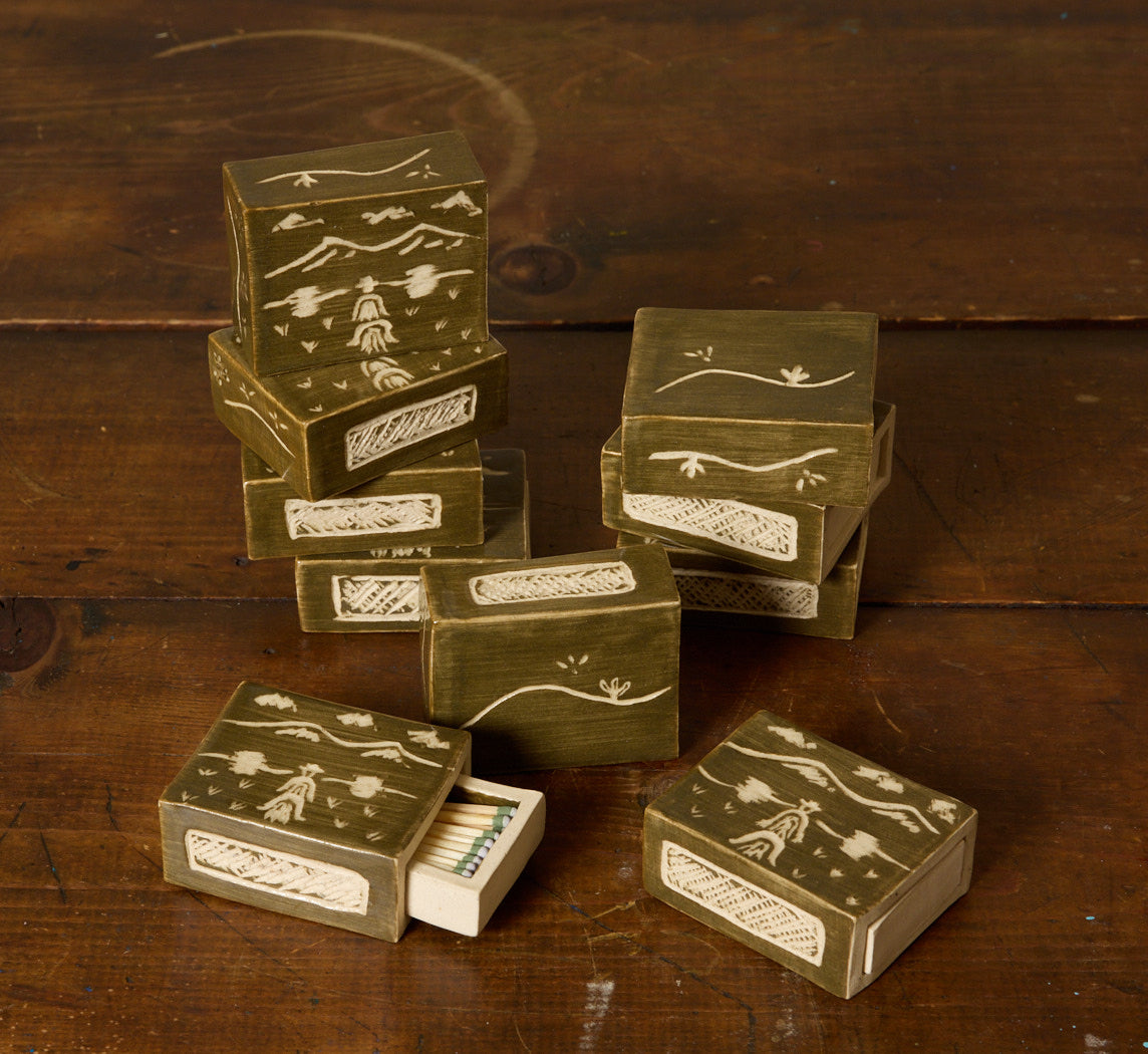 Handmade ceramic striker box by Danny D’s Mudshop, etched with a cowboy and desert landscape on earthy olive green glaze over stone clay. Holds wooden matches with a built-in striker and no two boxes are exactly alike.