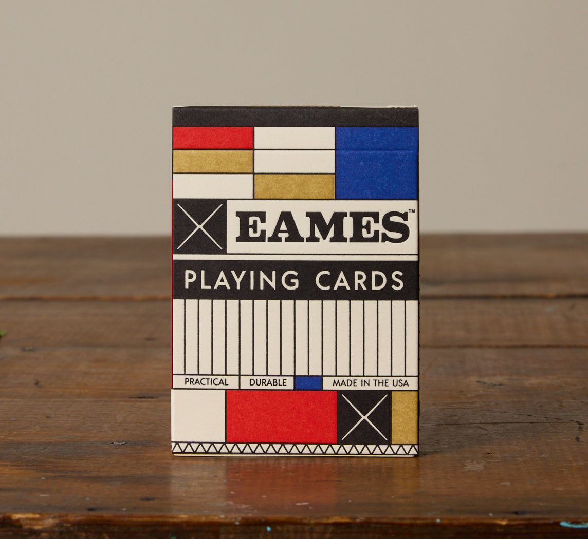 Eames “Starburst” Playing Cards with custom geometric faces and bold red-and-black bar numerals inspired by the Eames Office visual language. Printed in the USA and designed with Art of Play.