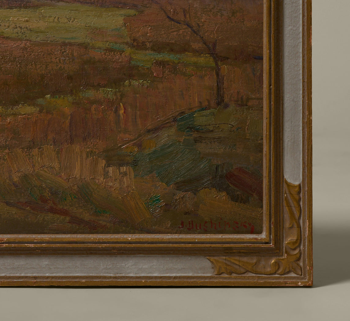 Early 20th-Century tranquil and hazy late autumn landscape dominated by muted greens, browns, and beiges, set within its original frame.