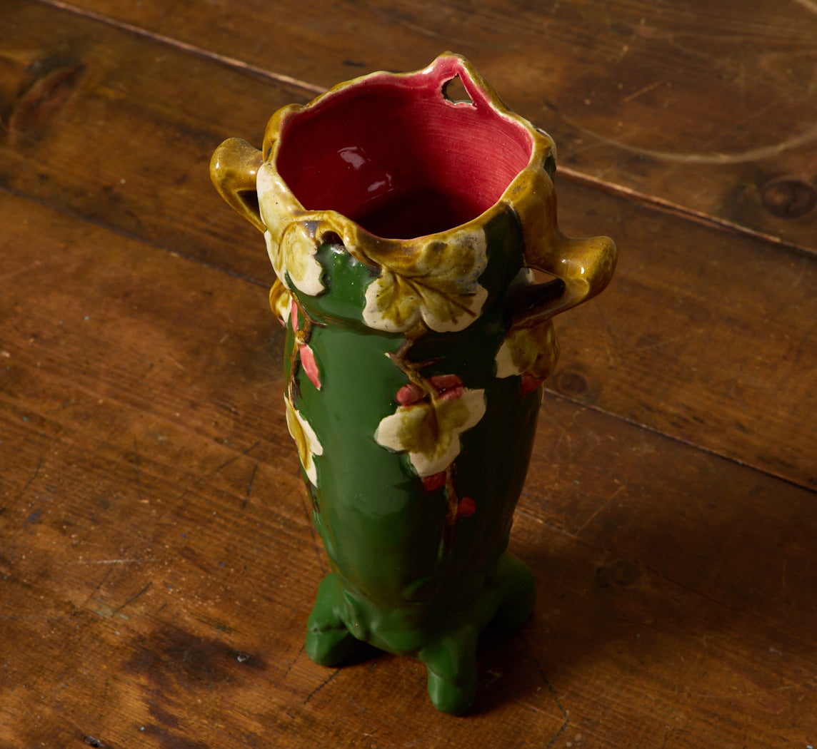 French Art Nouveau barbotine vase in a glossy green glaze with applied flowering branches and yellow-accented handles. Footed base and softly scalloped rim with hand-modeled relief detail throughout.