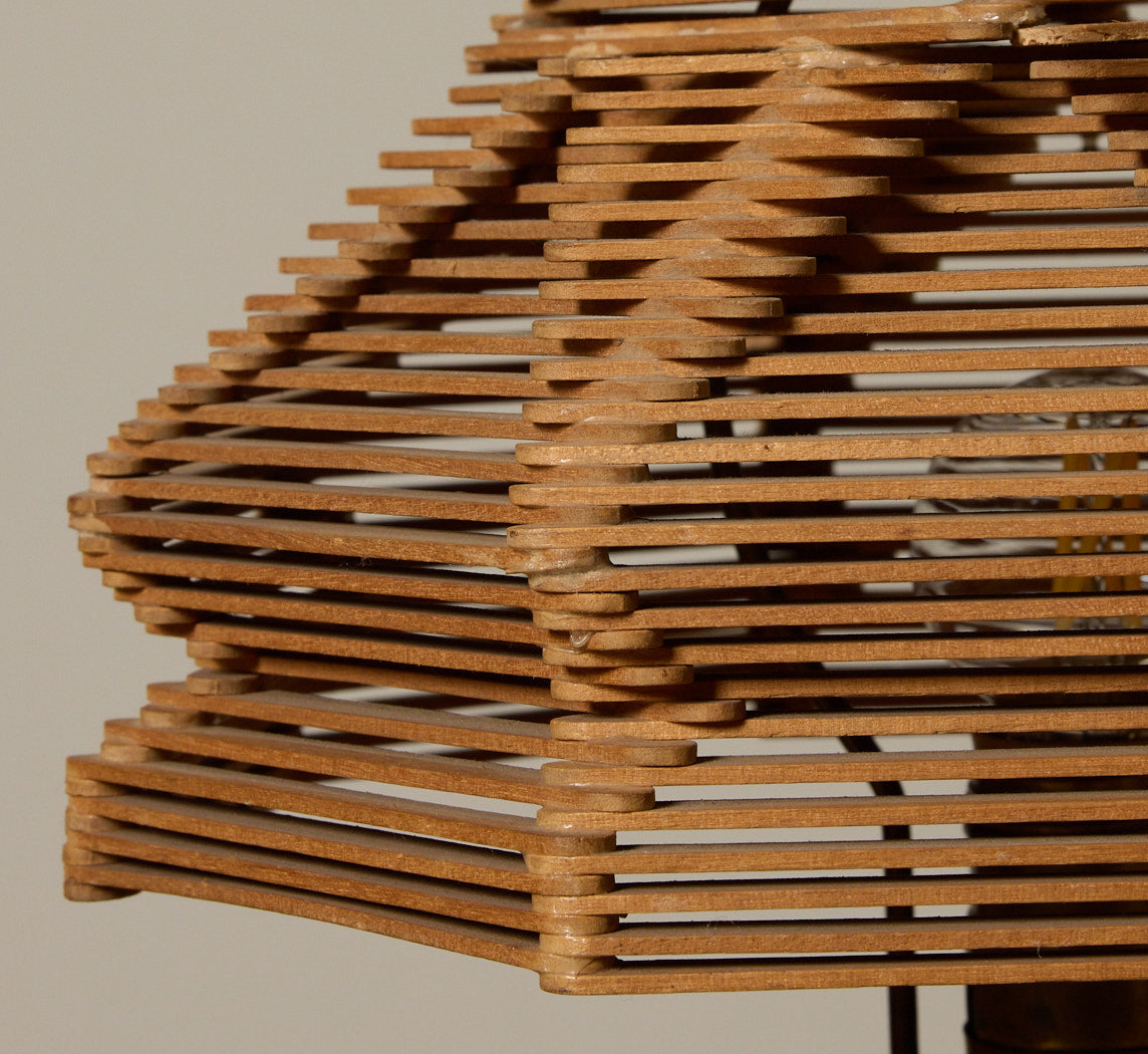 Geometric vintage tramp art lamp constructed from stacked wooden popsicle sticks in a sculptural hexagonal form.