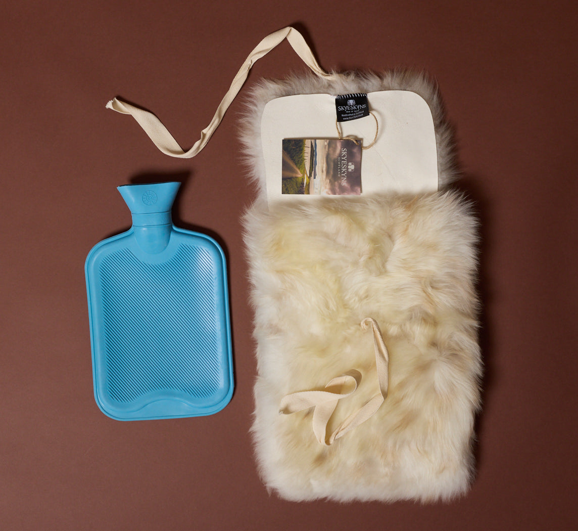 Isle of Skye sheepskin large hot water bottle cover in mottled. A plush, ethically sourced sheepskin cover with soft herringbone cotton ties, sized to hold the included 2L bottle. Thick, warm, and velvety to the touch, ideal for cold nights and easy to maintain with light brushing and spot cleaning.