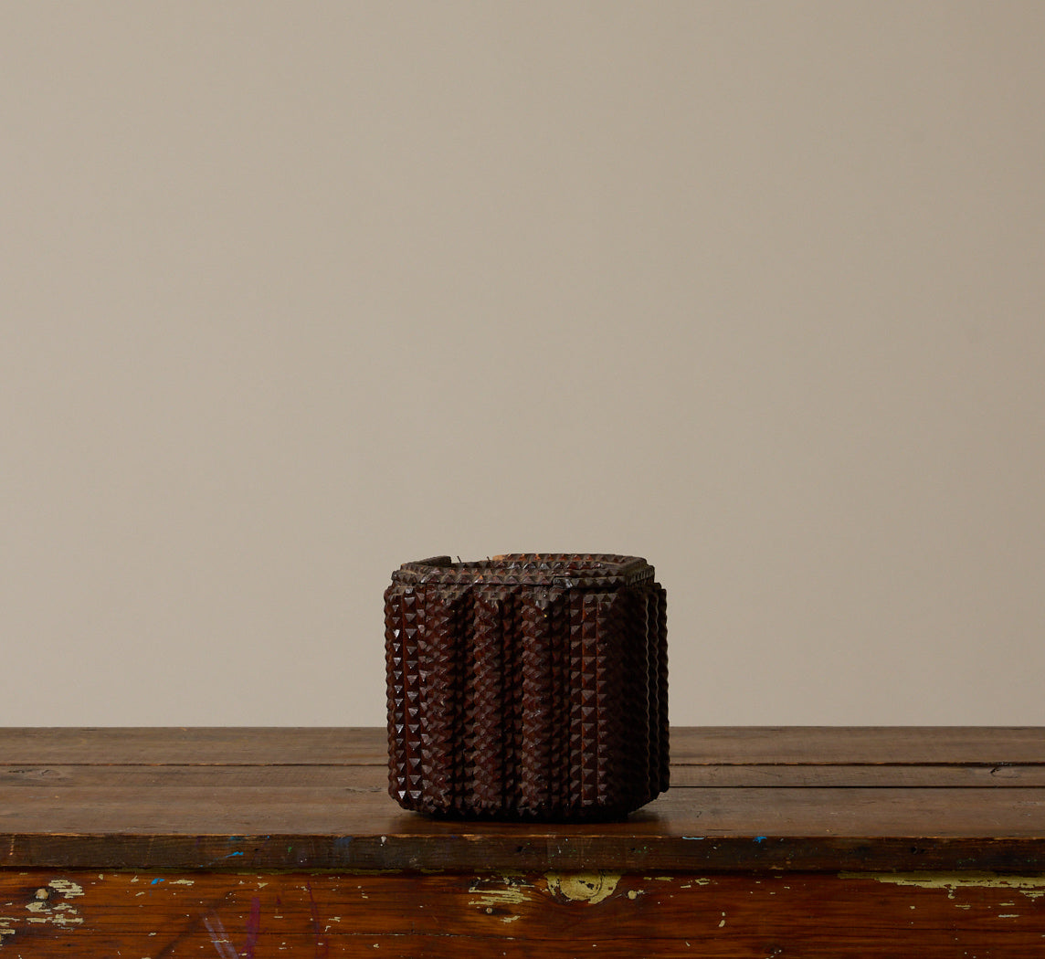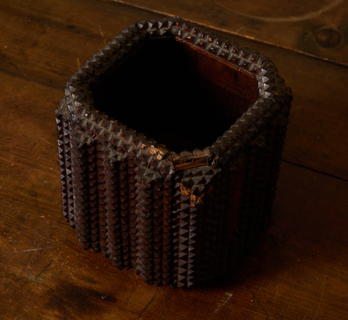 Late 19th century tramp art planter with an octagonal form and deeply carved chip-cut texture. Built from reclaimed shipping crate wood, showing honest wear and rich dark patina. Dimensions: 6" L x 6" W x 6" H