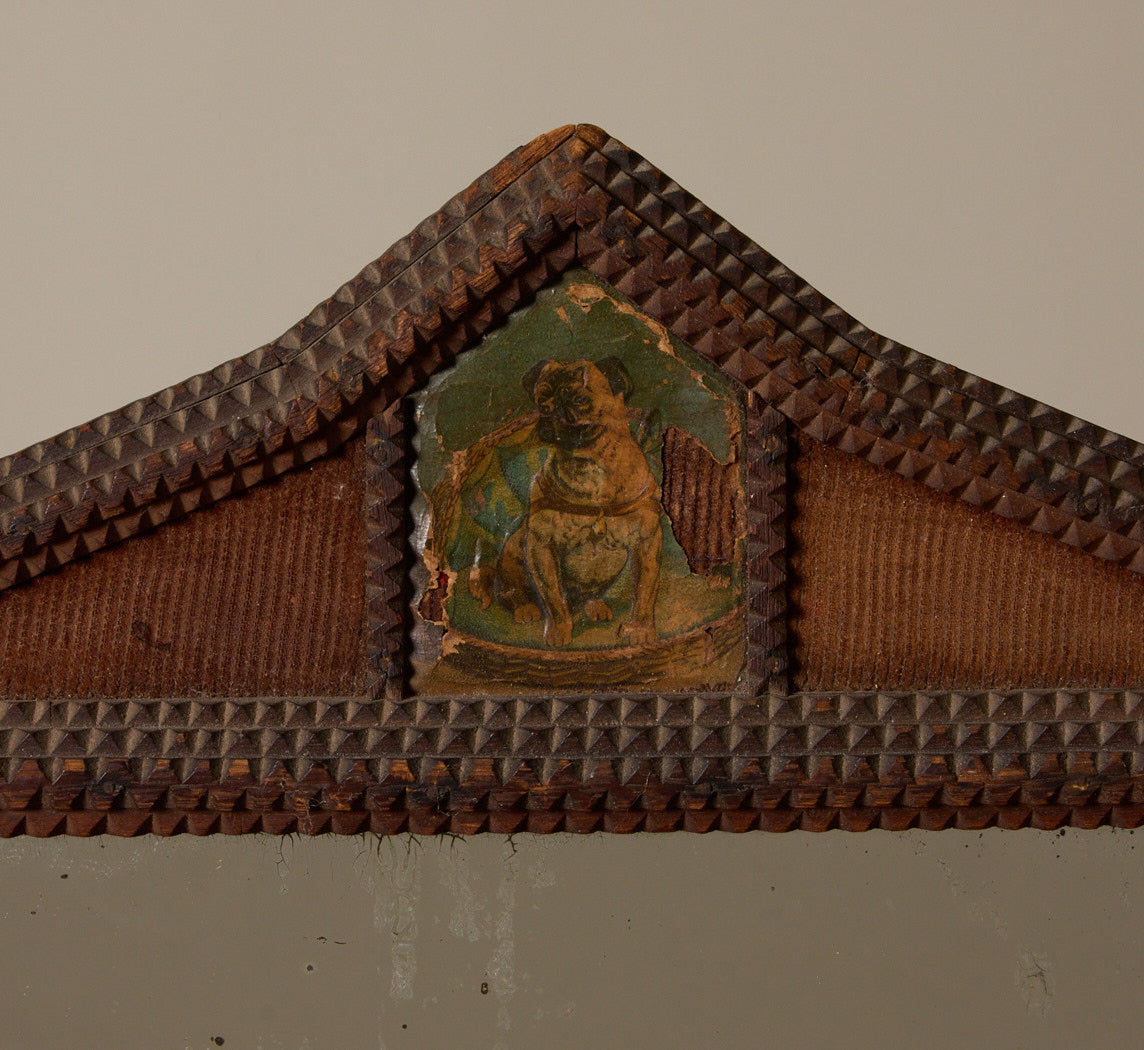 LATE 19TH CENTURY TRAMP ART WALL MIRROR WITH LITHOGRAPH SCENES