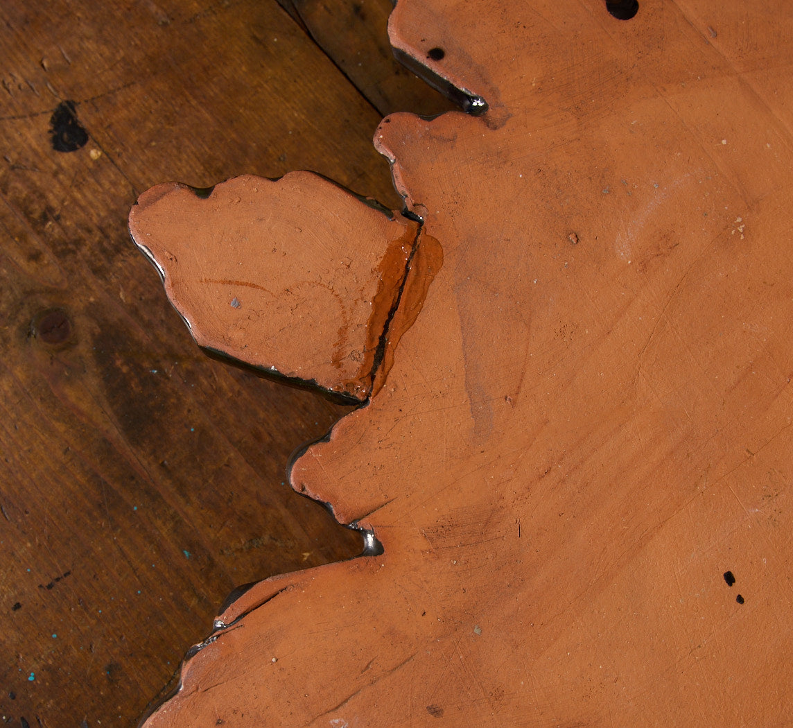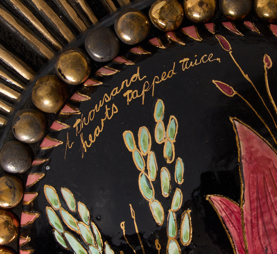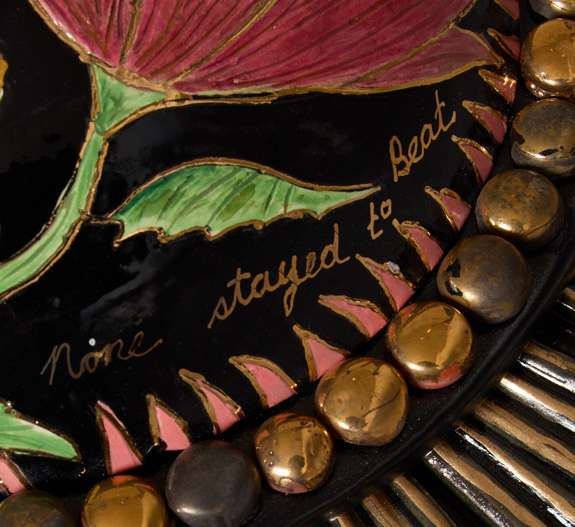 A glossy black ceramic starburst medallion with bold gold striping and a hand-painted central flower in deep red and green. The raised beaded border adds dimension, making it a strong standalone wall accent.