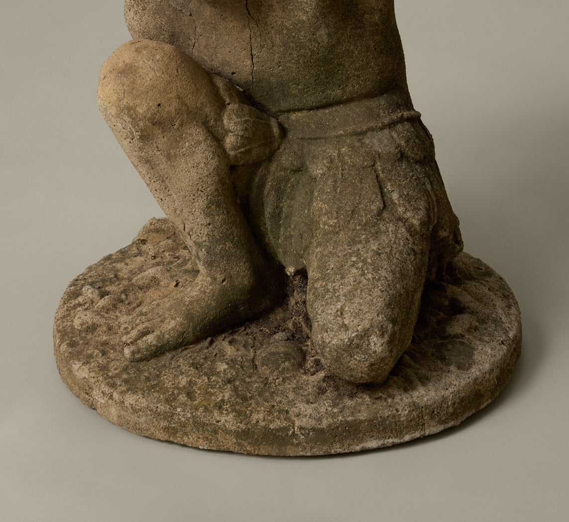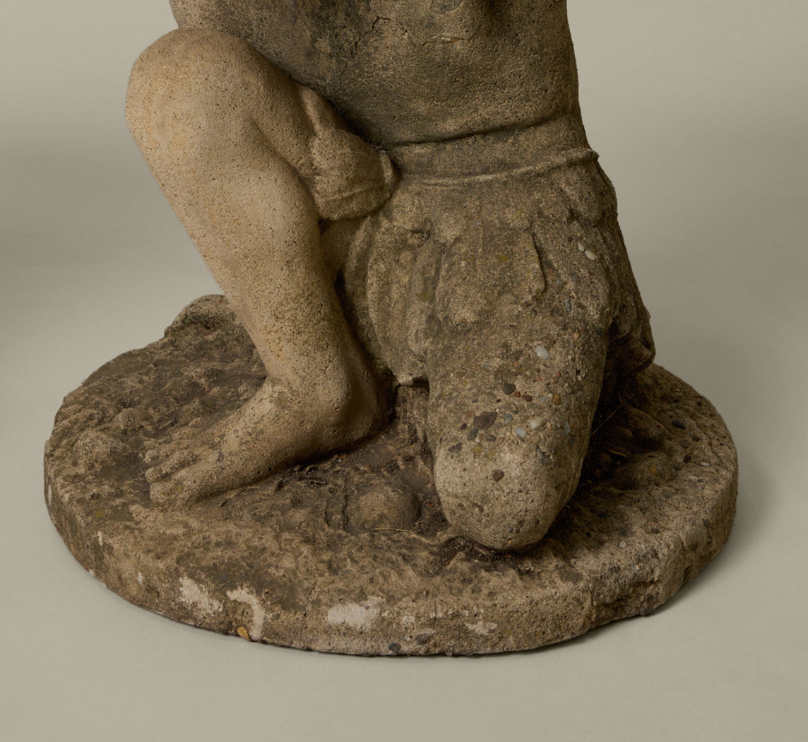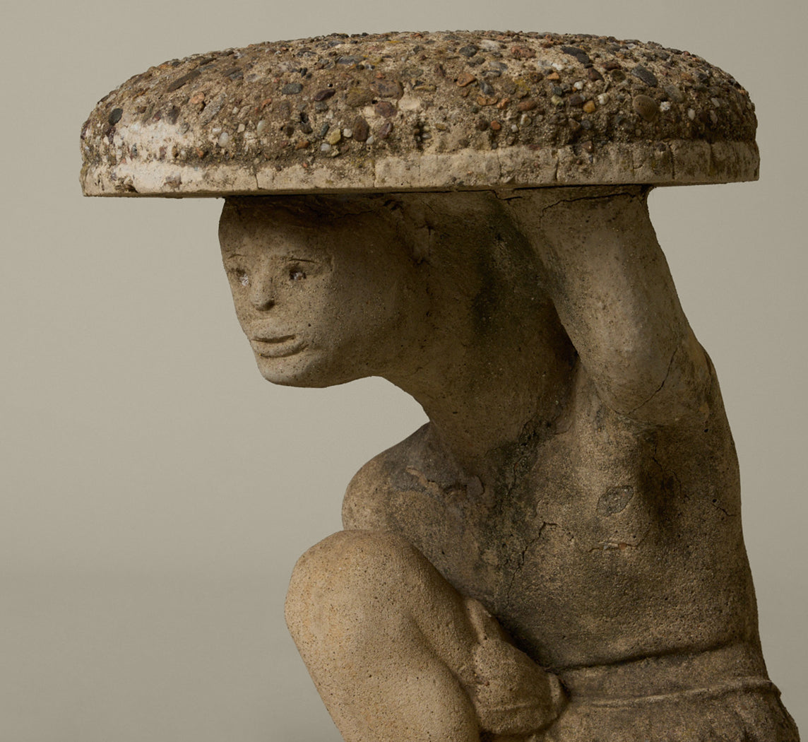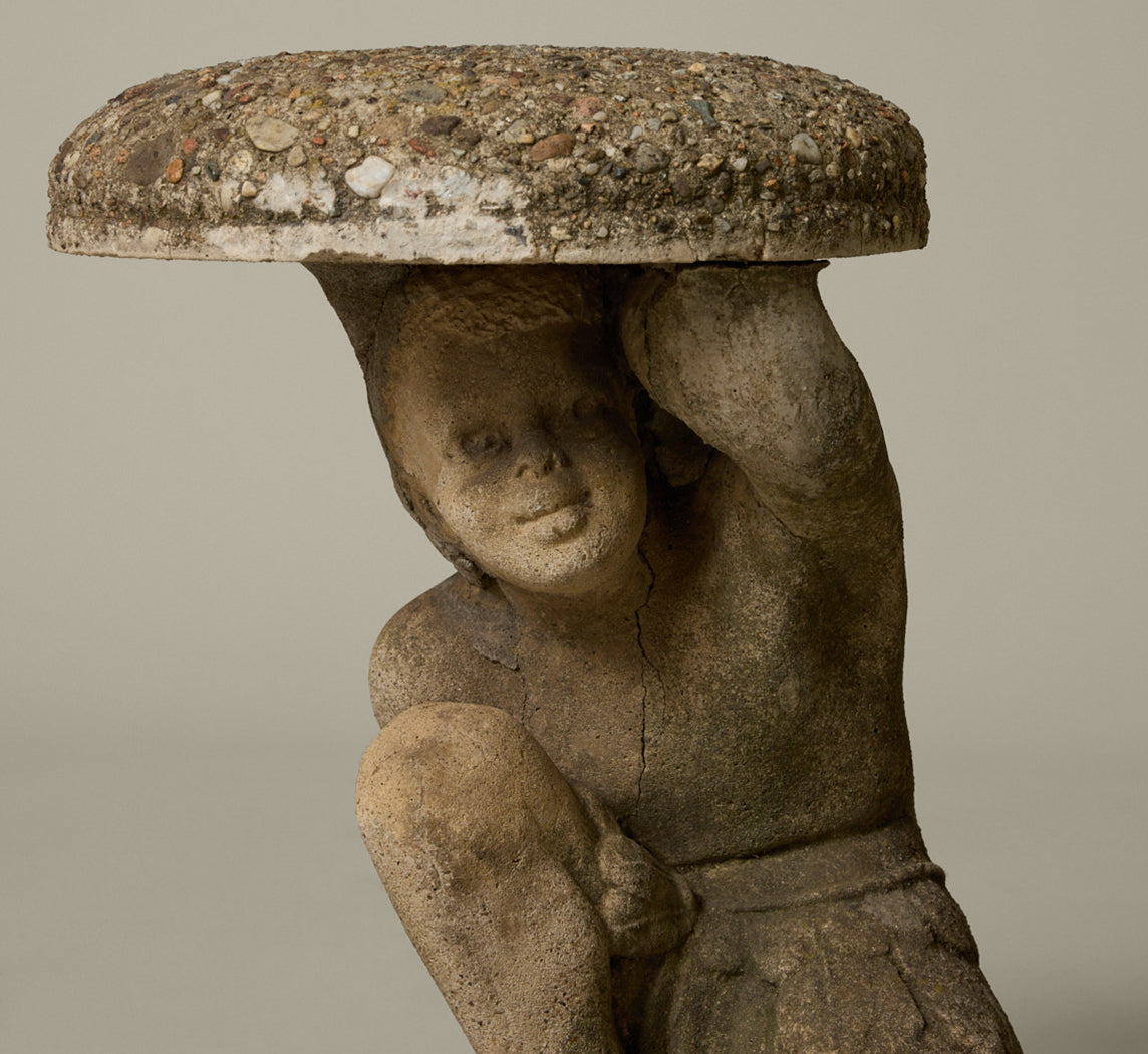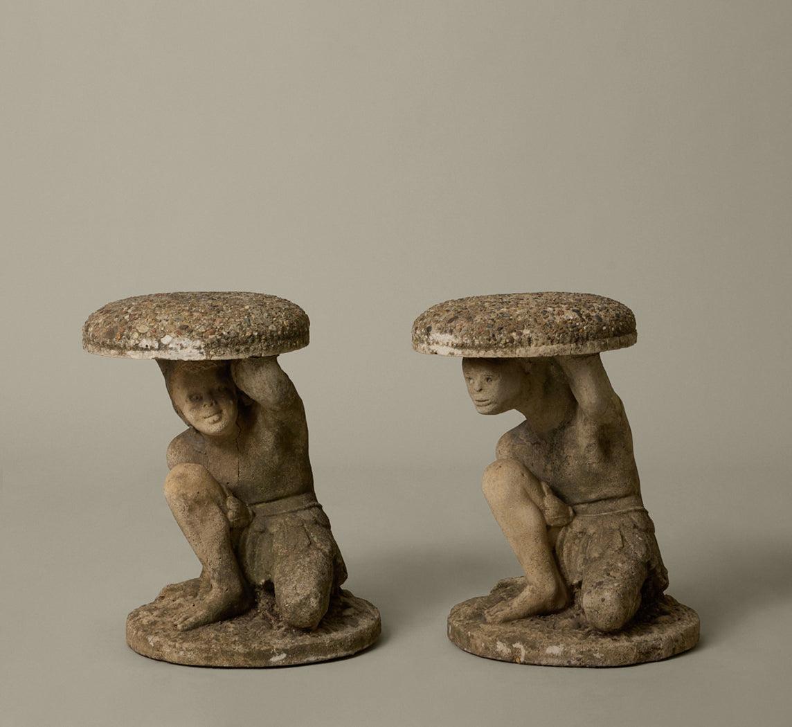 Pair of mid-century French cast stone garden tables with crouching figural bases and stone aggregate tops.