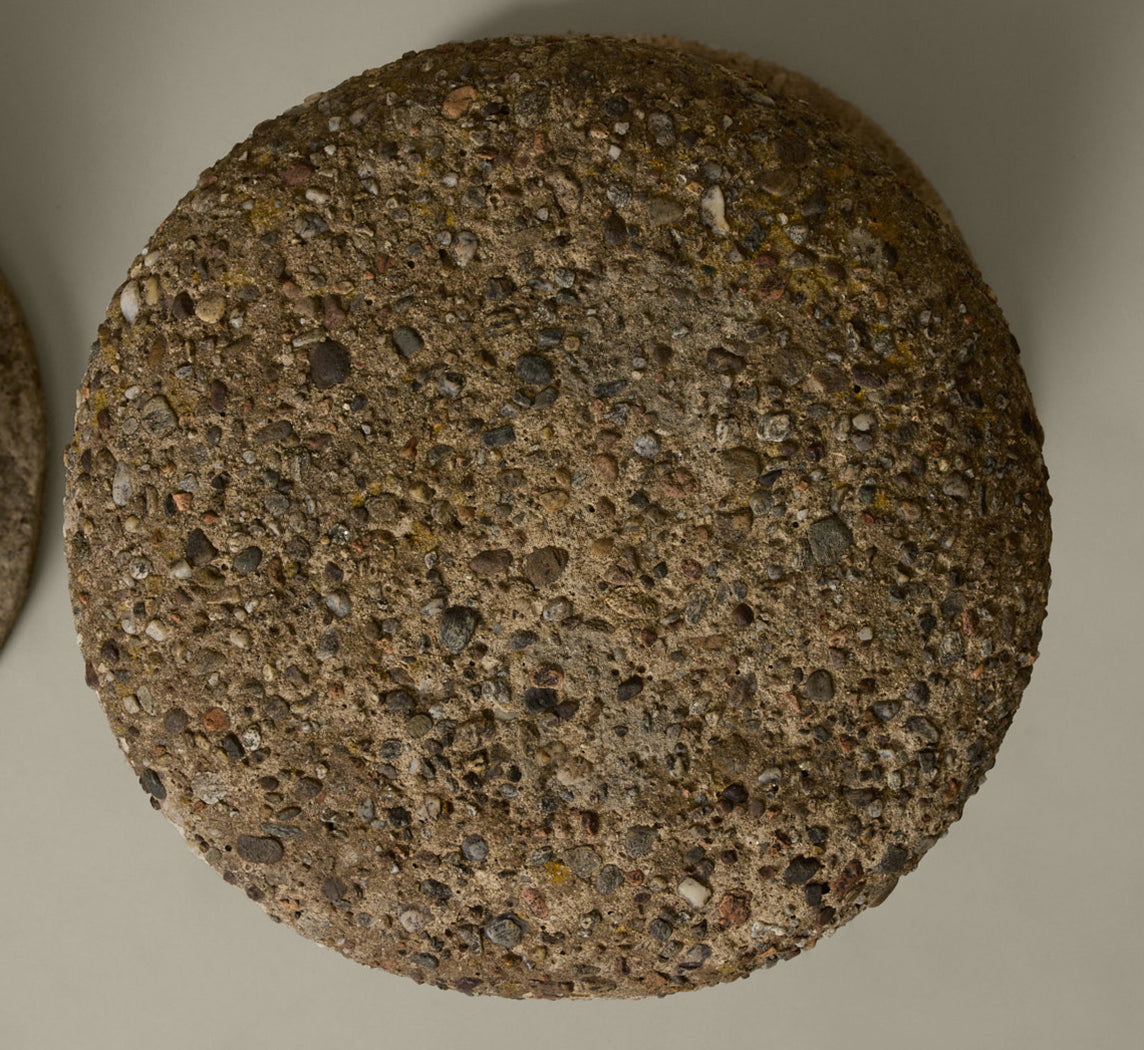 PAIR OF MID CENTURY FRENCH FIGURAL CAST STONE GARDEN TABLE WITH STONE AGGREGATE TOPS