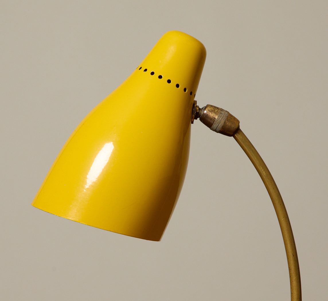 Mid-century Italian desk lamp with a mustard enamel shade and base paired with a curved brass stem and hardware. Perforated shade detailing and an adjustable neck provide focused directional lighting.Newly wired for US use with gold French cord.