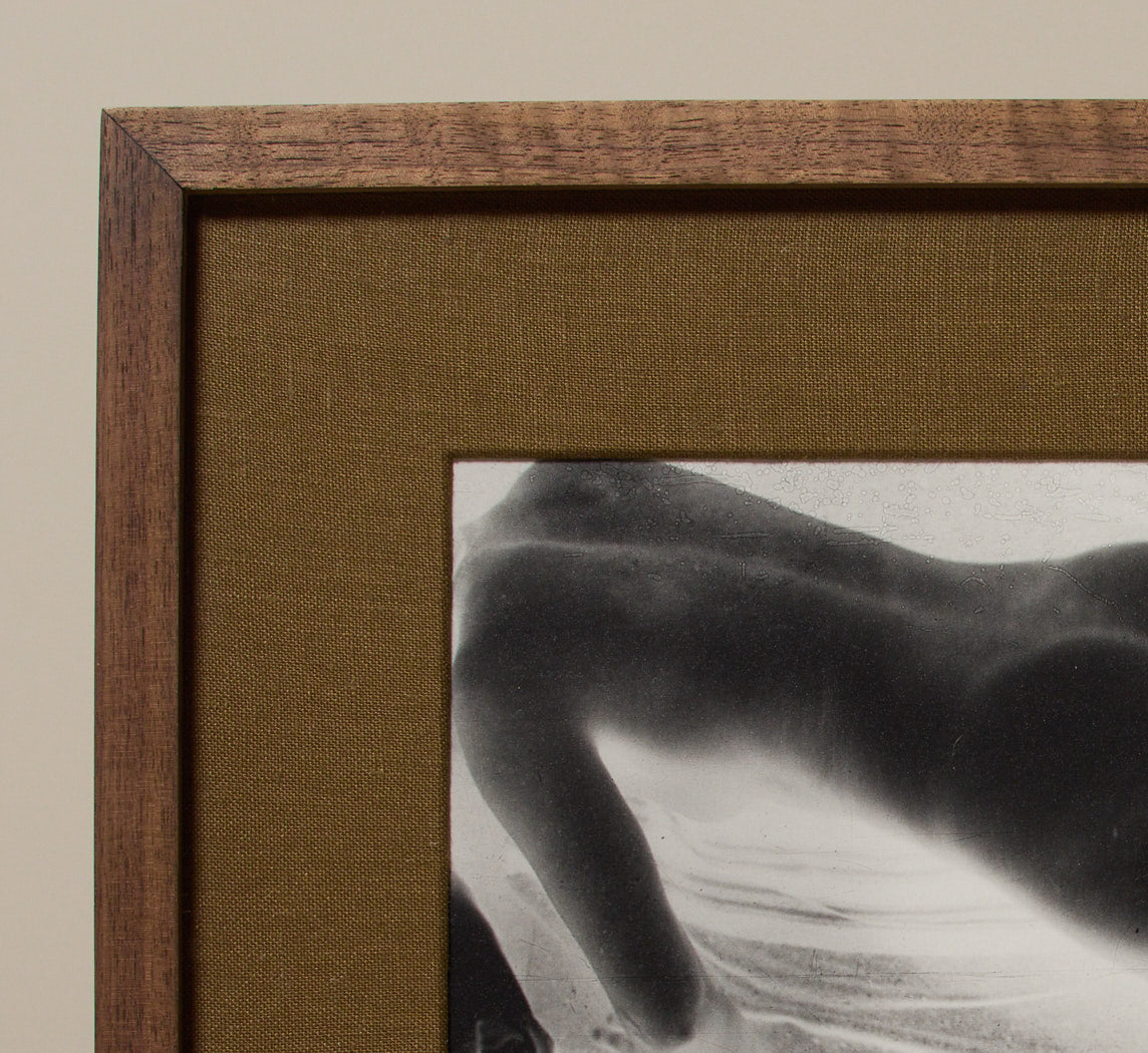 Gelatin-silver print from an original negative by Franz Roh (1890–1965), titled Weiblicher Rückenakt (negative), dated 1922–28. Printed for Griffelkunst Hamburg (1999) and stamped verso, this striking reclining nude is matted in a mustard olive linen mat with a walnut frame.