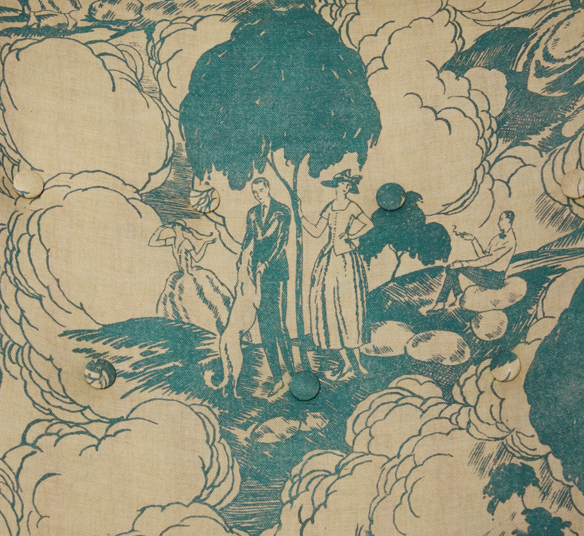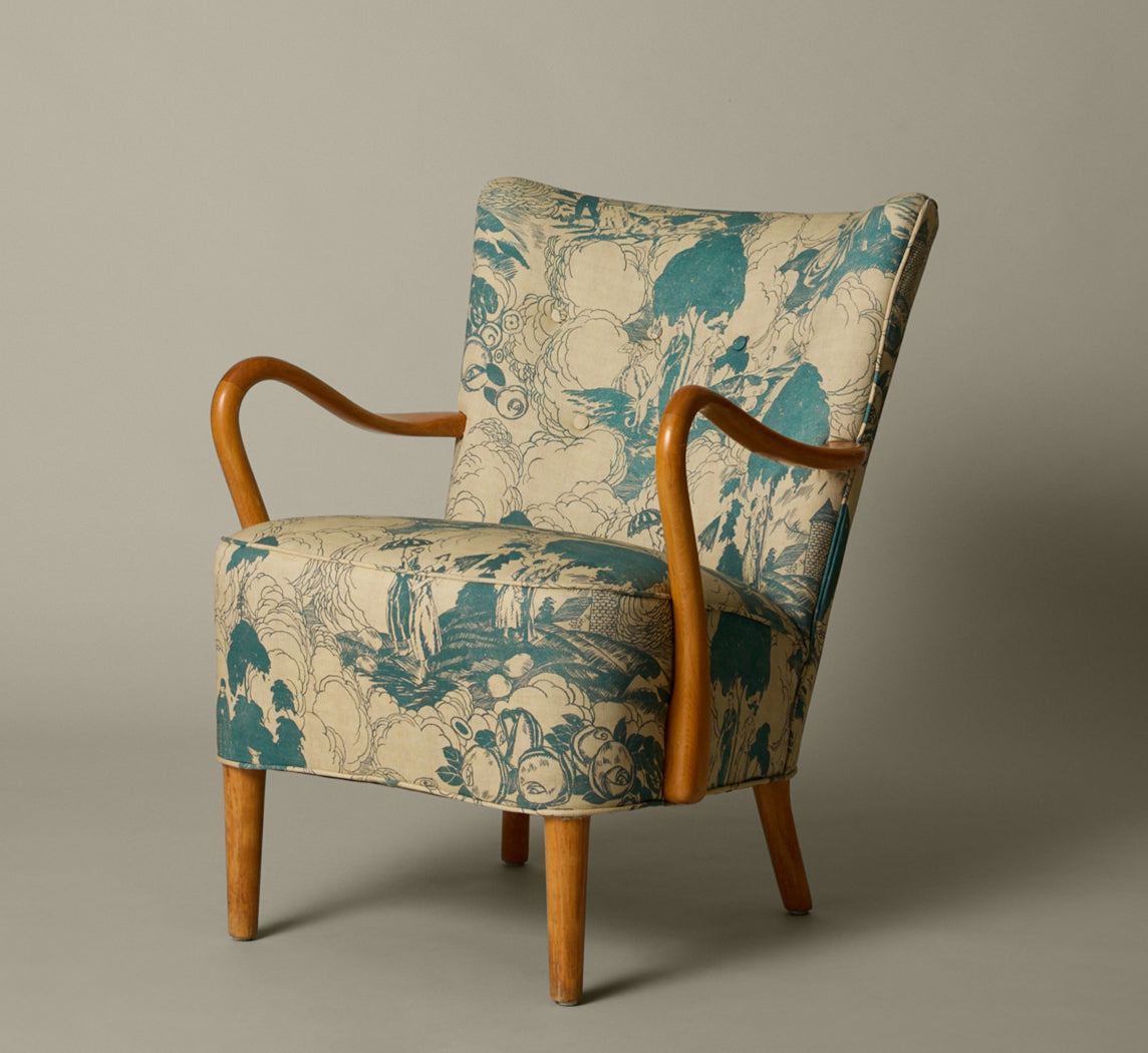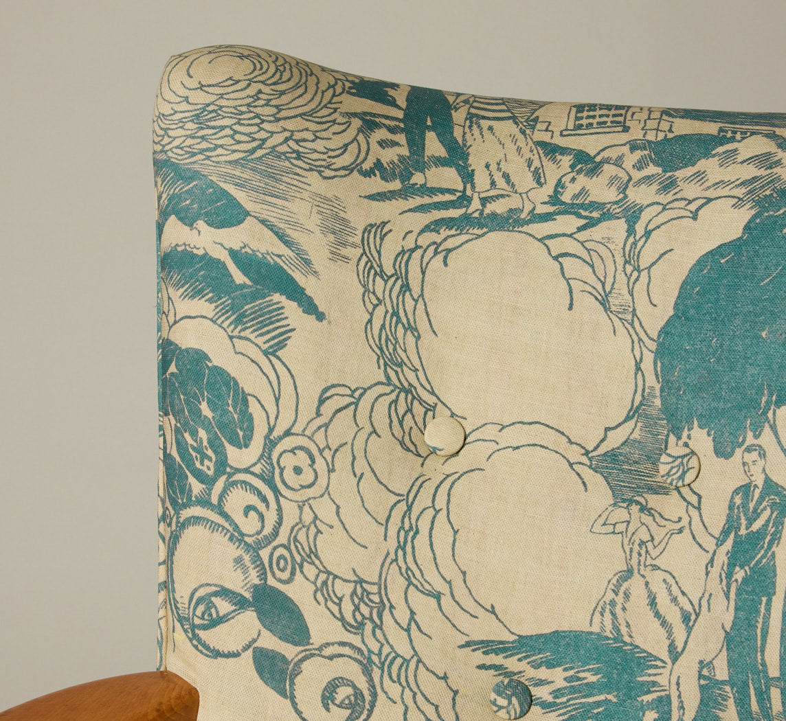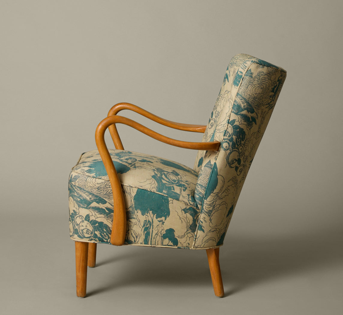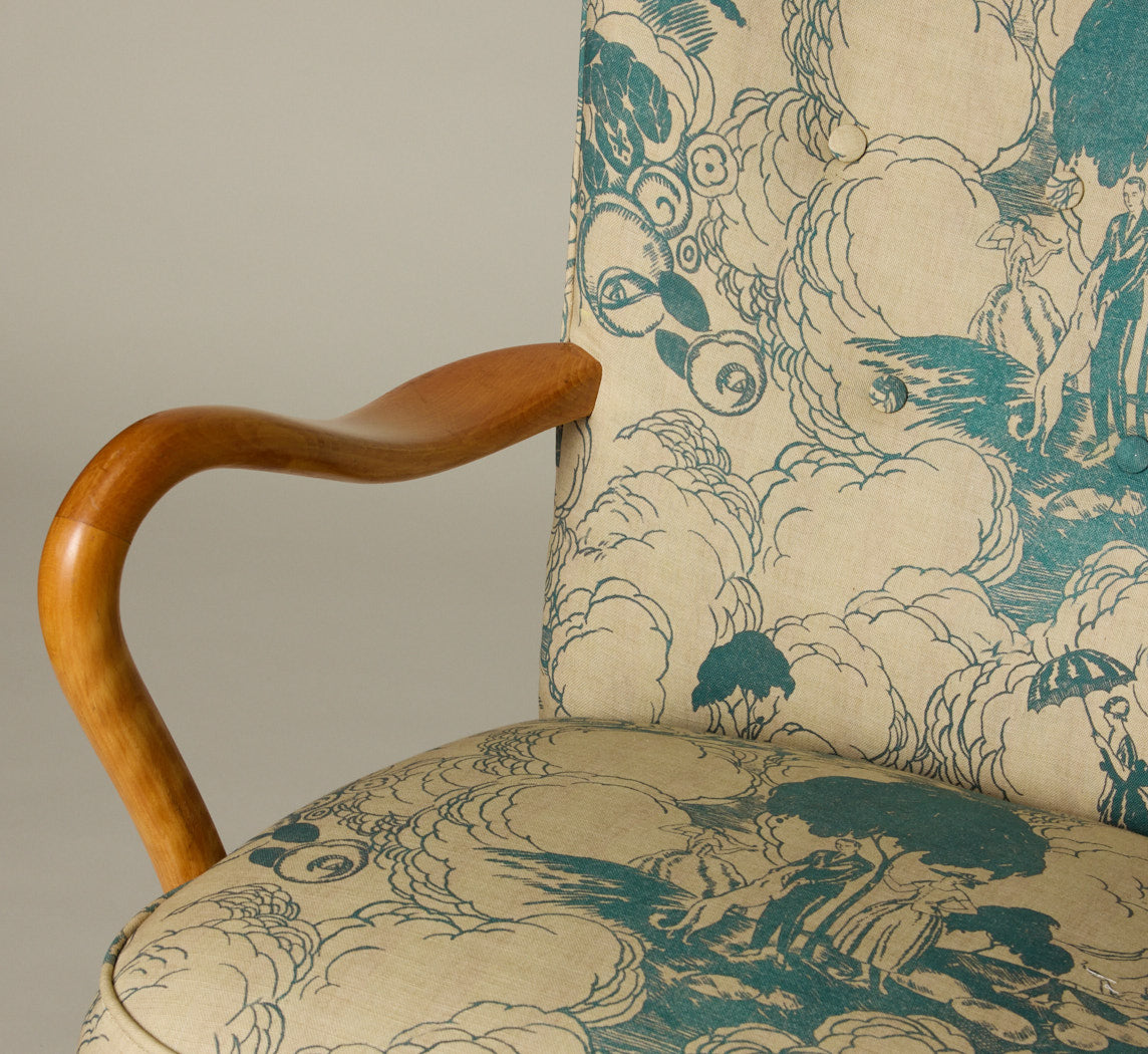 1950s Art Deco-style Danish lounge chair with sculptural beech arms and legs, upholstered in Pierce & Ward Parasol teal blue printed linen.