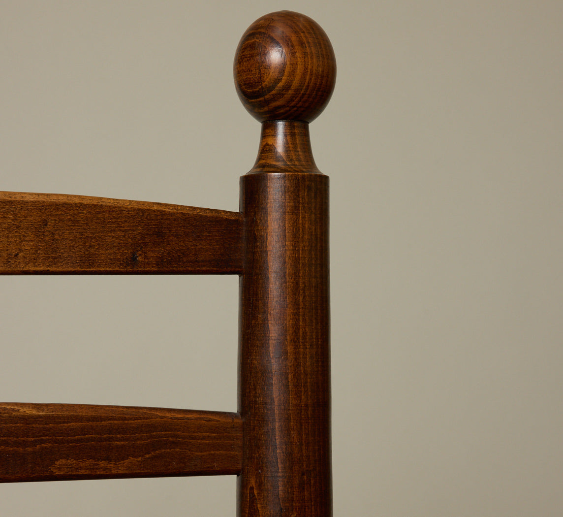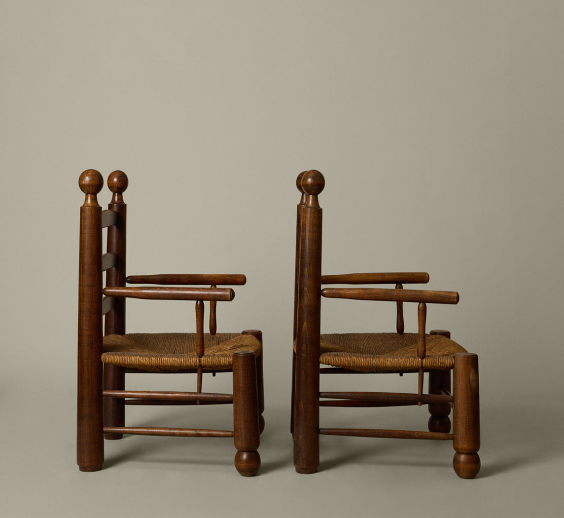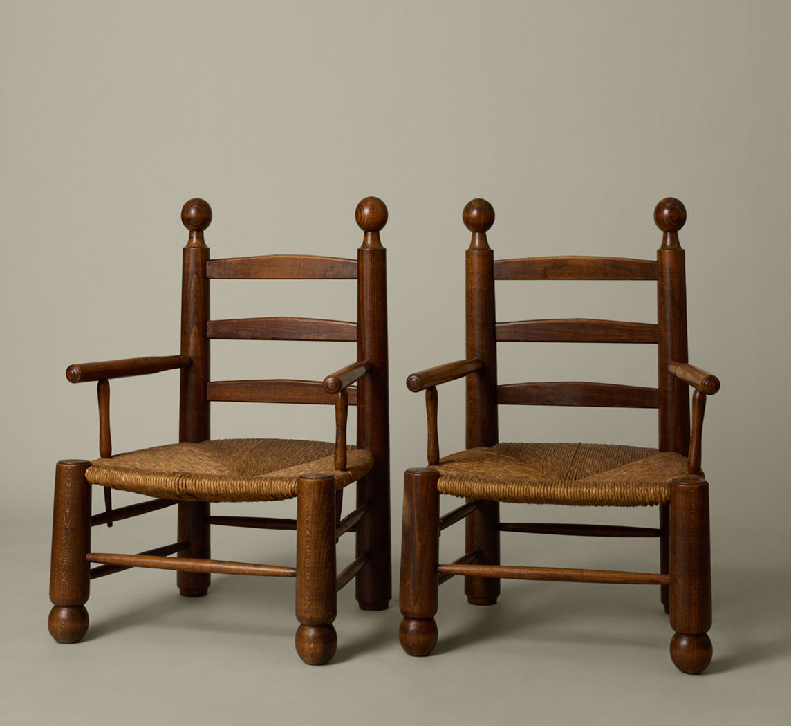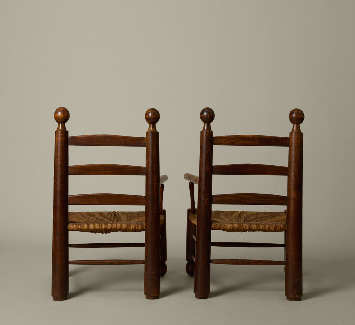 1940s French turned wood armchairs by Charles Dudouyt, with ladder back, ball finials, and woven rush seat.