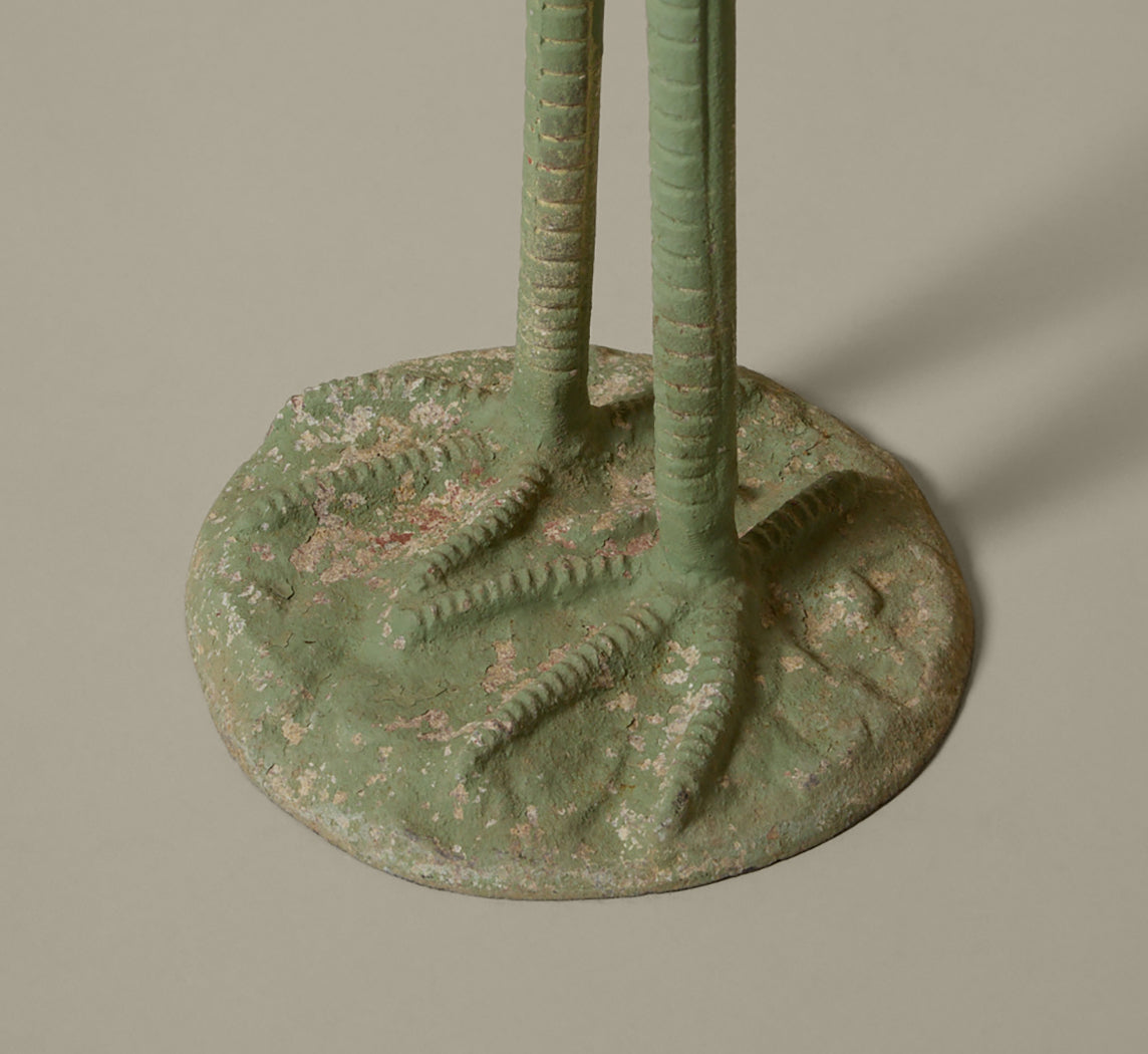 Pair of vintage aluminum crane garden sculptures with a weathered painted finish and graceful tall form.