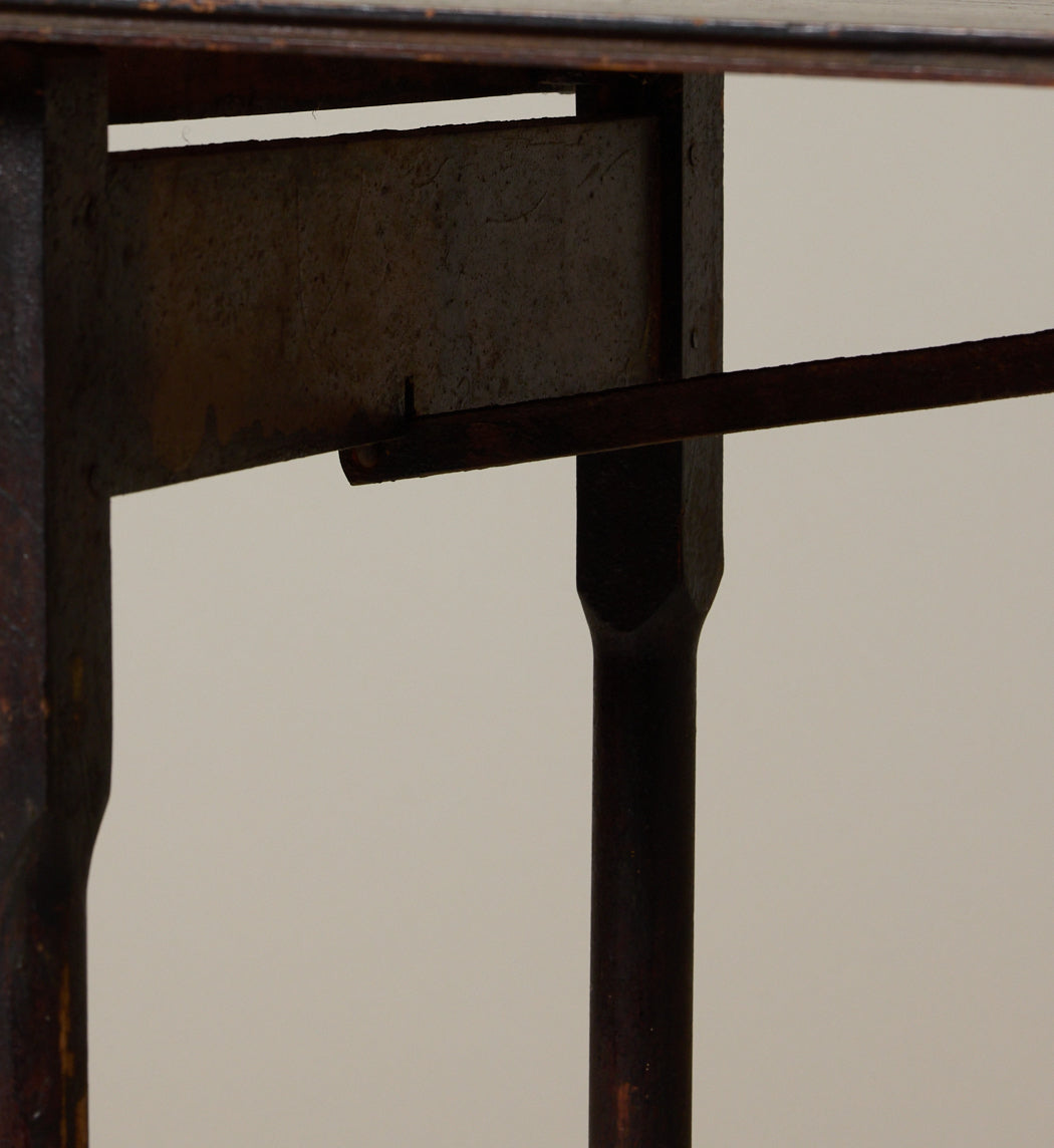 Petite primitive noir side table with a hand-carved wooden top, slender turned wood legs and X brace support.