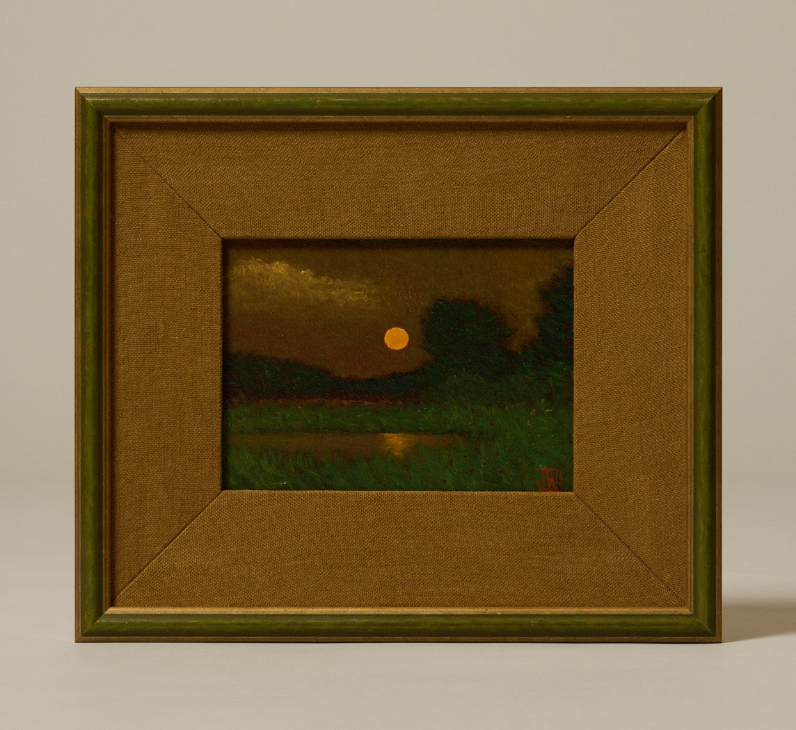 Petite oil on panel landscape titled Marsh Sunset by Maine artist Joe Wojdakowski, depicting a quiet marsh scene at sunset in soft atmospheric tones. Signed lower right and presented in a gold and green frame with seaweed linen mat.