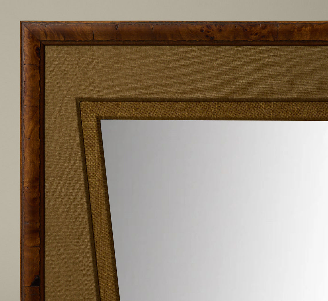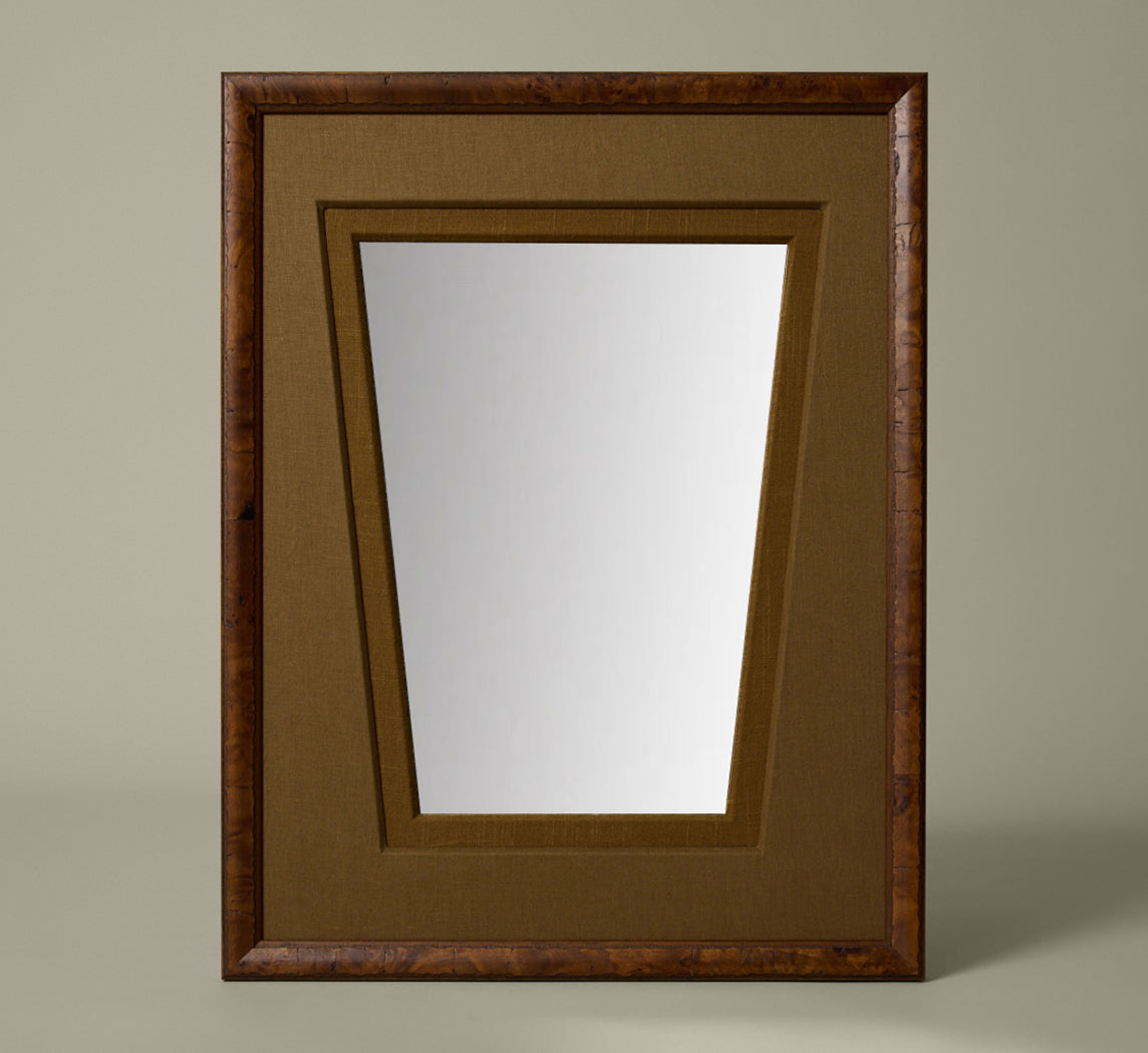 Pierce & Ward Carpathian Hall Mirror with trapezoid mirror inset, mustard olive and seaweed linen matting, and chestnut burl frame.