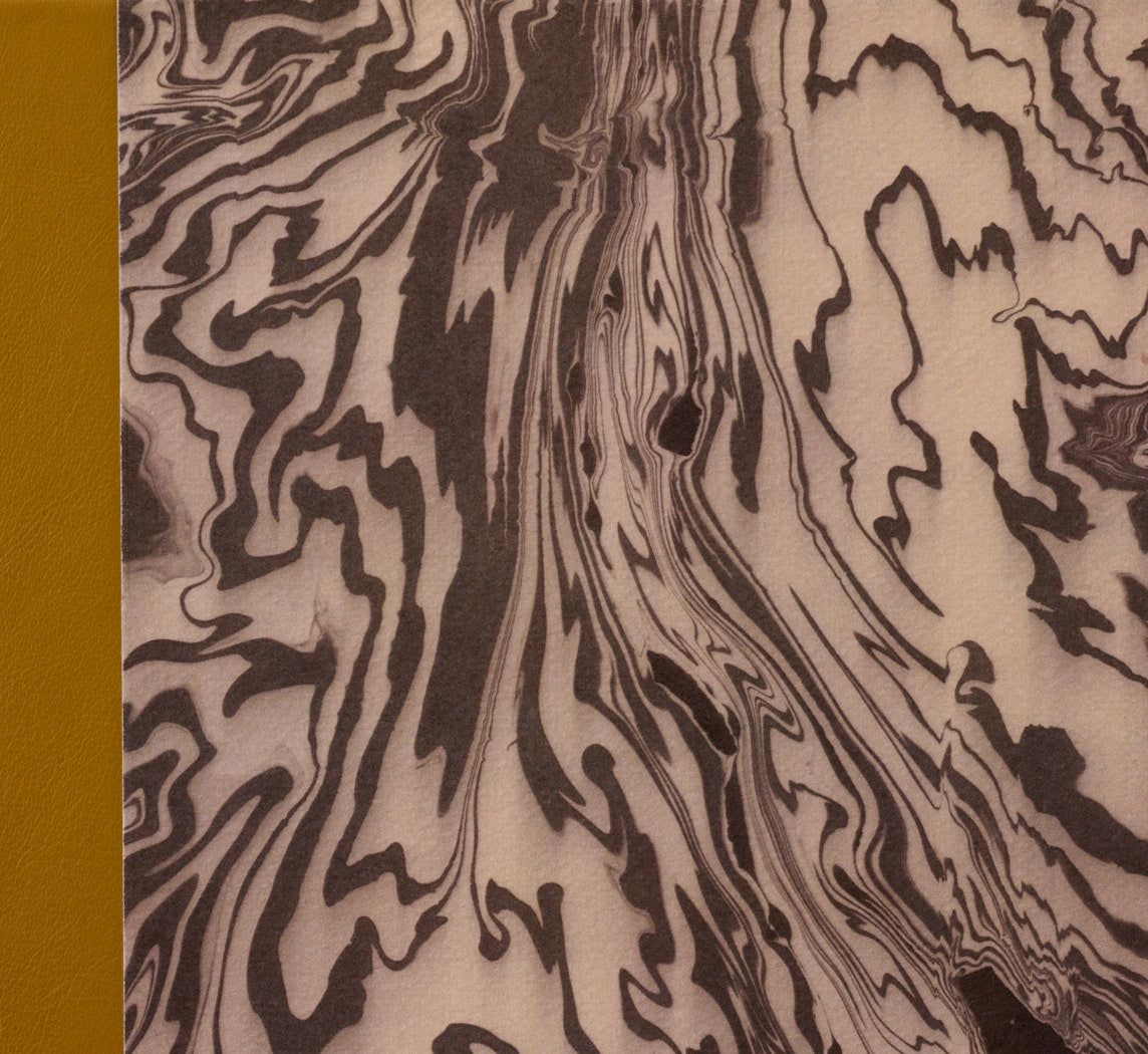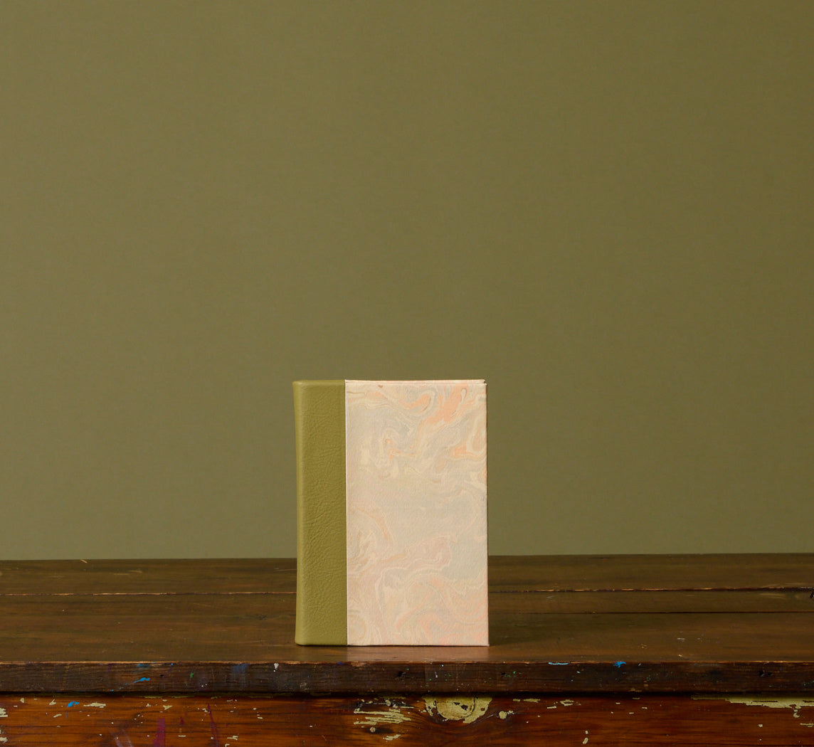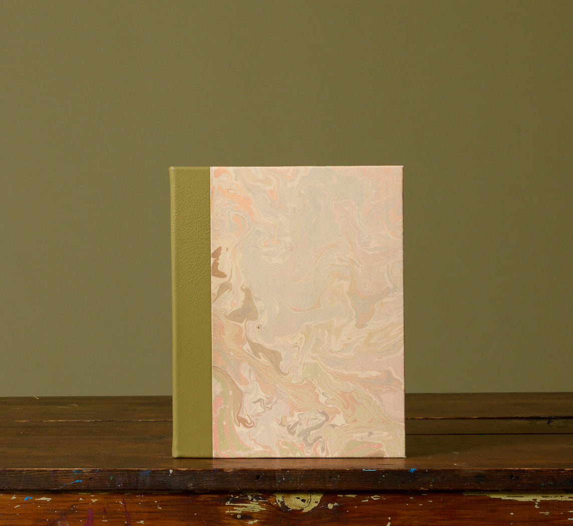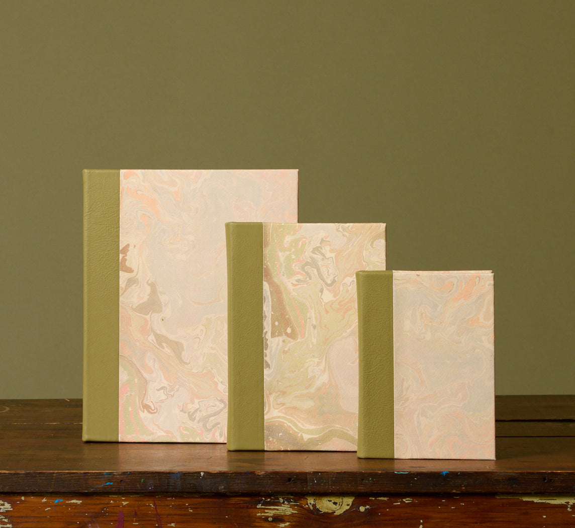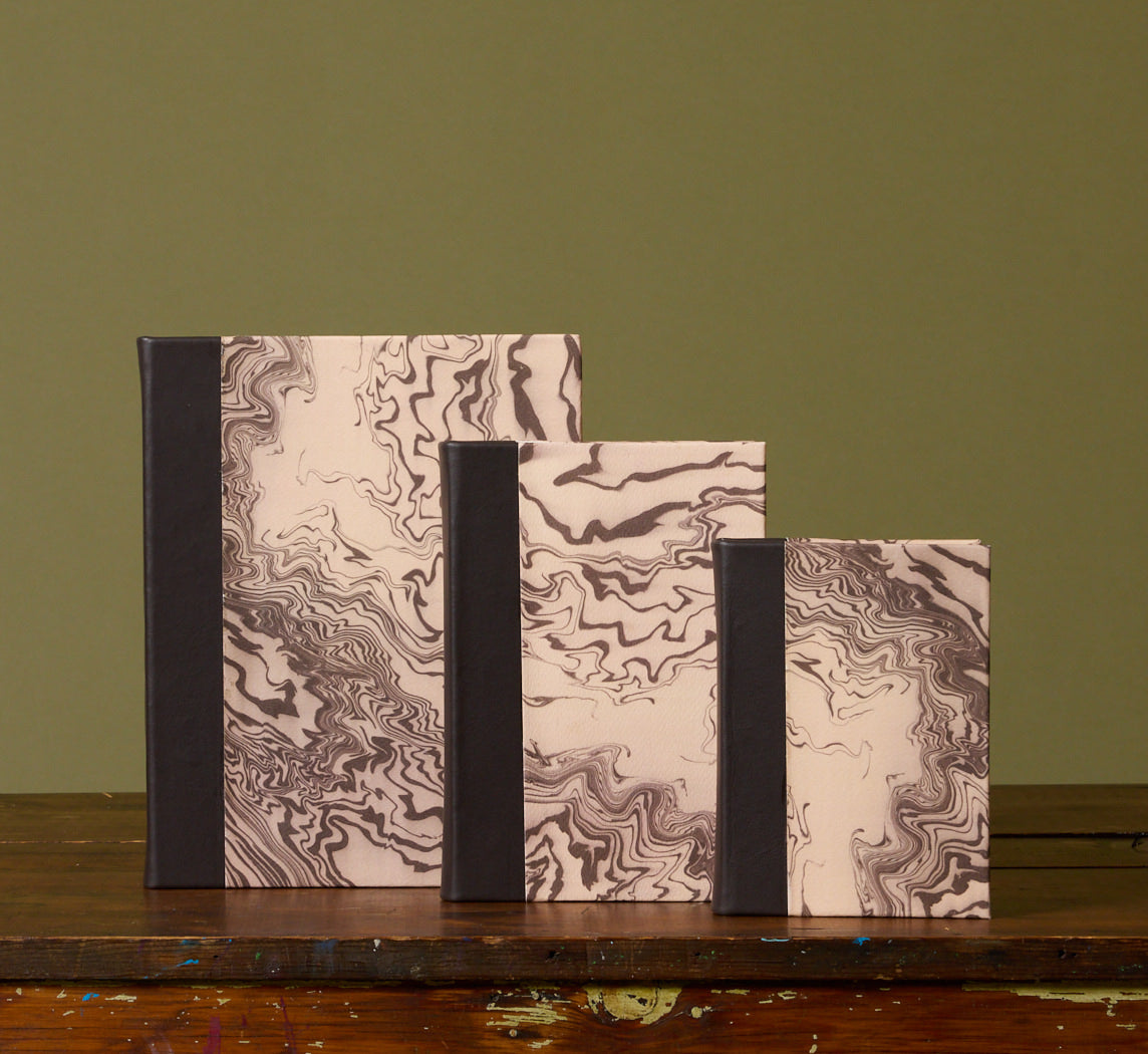 Pierce & Ward Florentine notebook, handmade of Suminagashi swirl paper by Ansuini & Co. and tonal leather spine. Available in three sizes and four signature colors, each one crafted by hand by a multigenerational atelier in Florence.