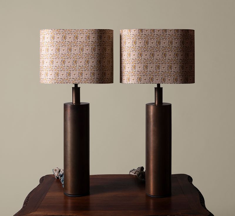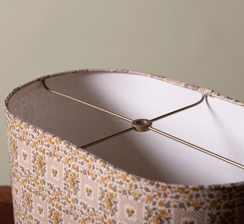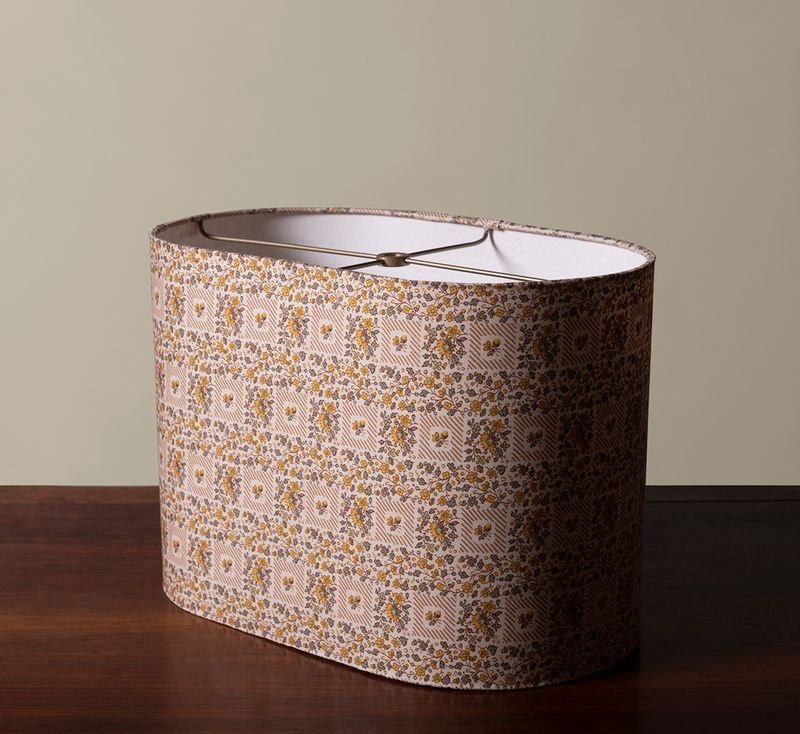 New Pierce & Ward oval race track lampshade, hand made in Los Angeles in a lovely English scrapbook cotton with floral grid pattern. The perfect shape shade for console and bedside table lamps. Lined in cream cotton with brass spider crossbar configuration.